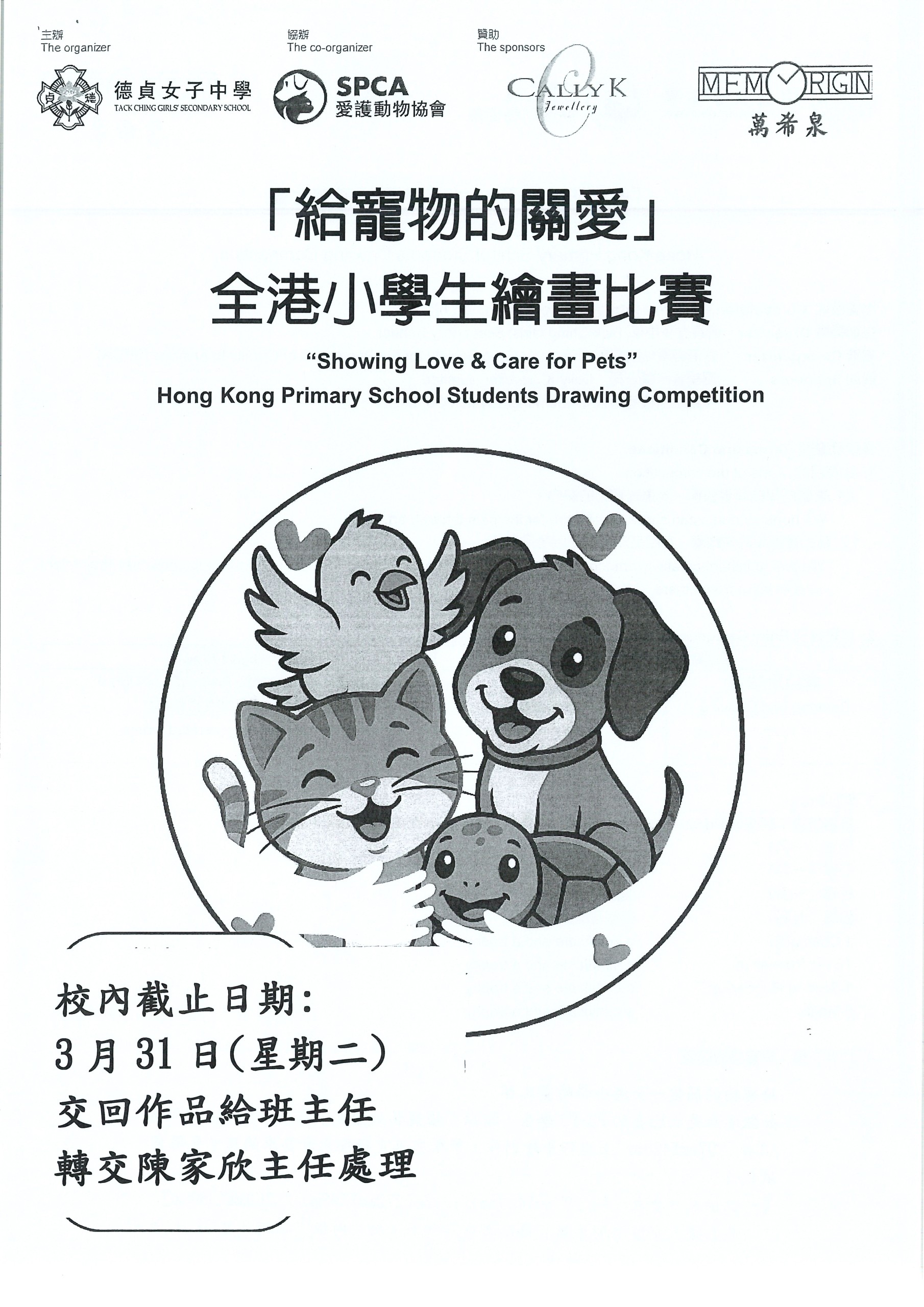 如欲參加是次比賽的P1-P2學生,請於正面創作,並填妥表格,於校內截止日期3月31日(星期二)交回作品給班主任轉交陳家欣主任處理。