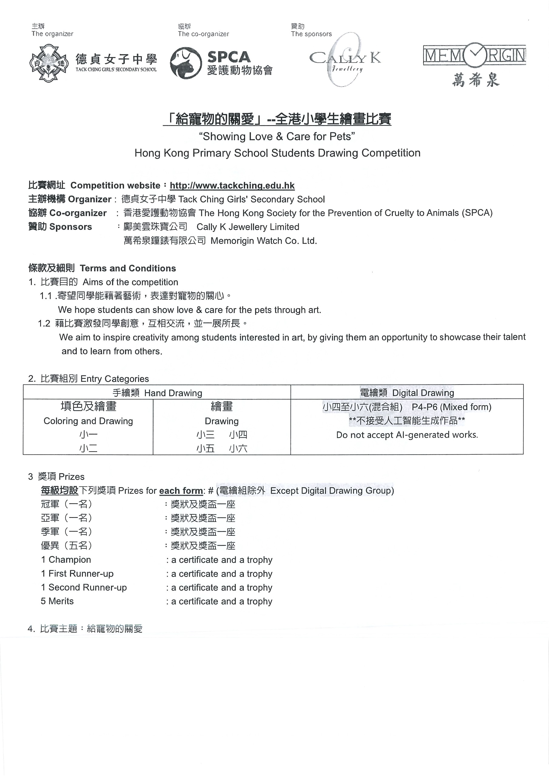 如欲參加是次比賽的P3-P6學生,請以「給寵物的關愛」為題,於學校提供的A3紙(297mmX420mm)上進行手繪創作。學生亦可自行按大會要求的尺寸自備畫紙創作。