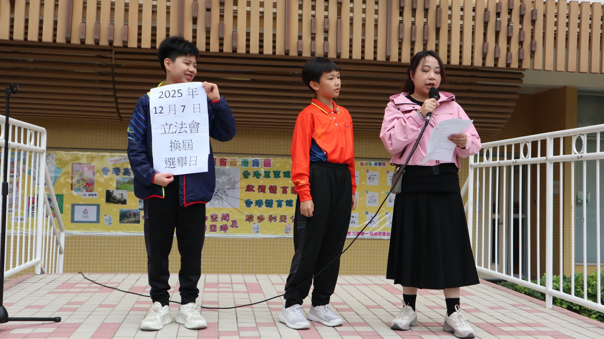 本校的「校園基本法大使」向全校師生介紹2025年12月7日(星期日)香港第八屆立法會換屆選舉的事宜,並向全校同學講解選舉乃公民的責任,以及其意義和重要性。
