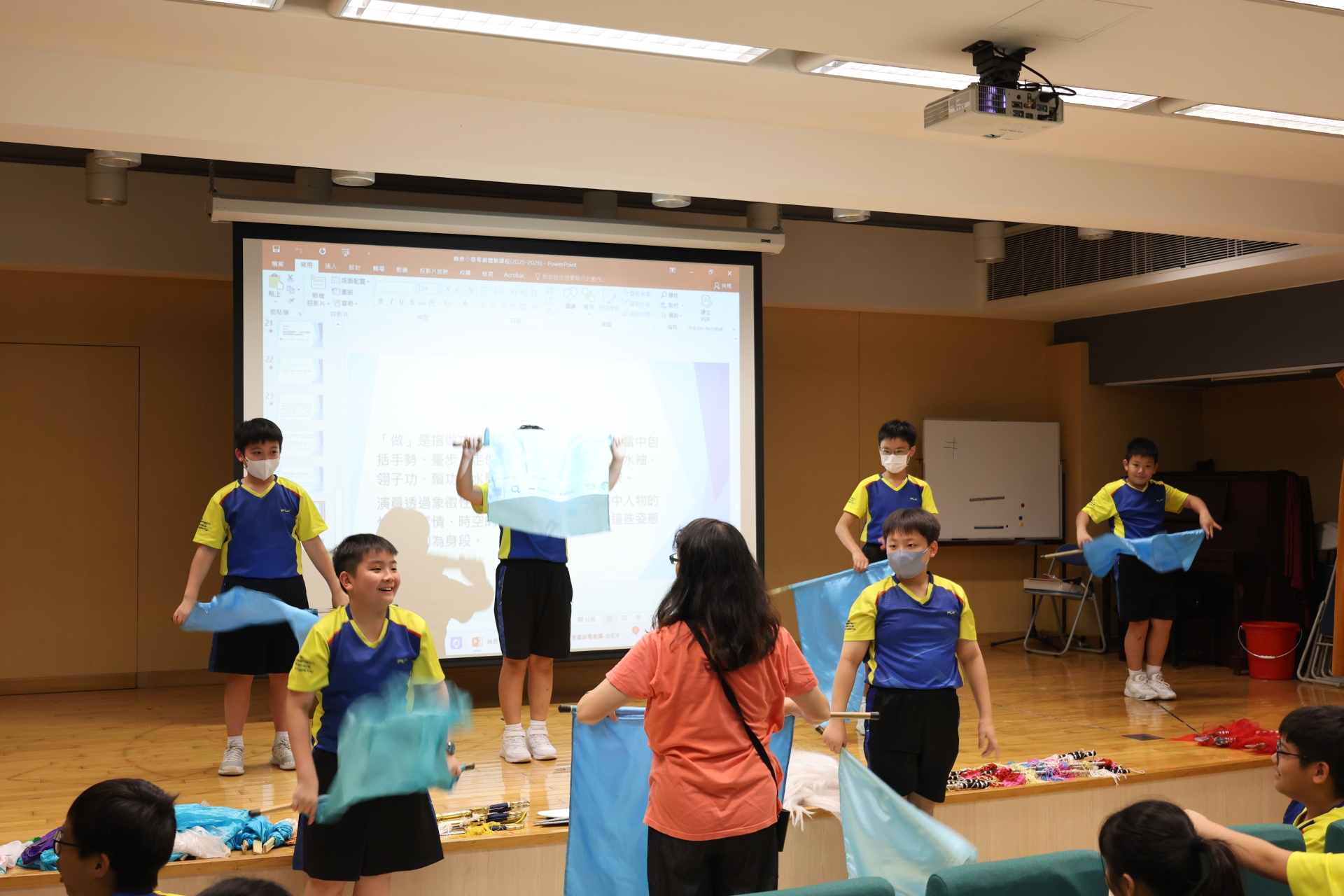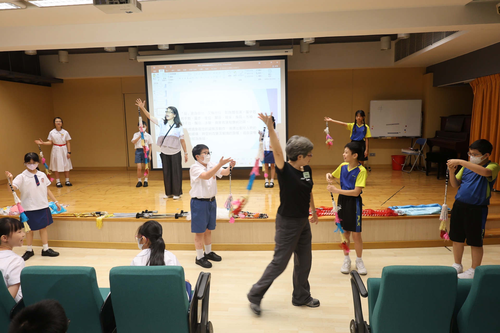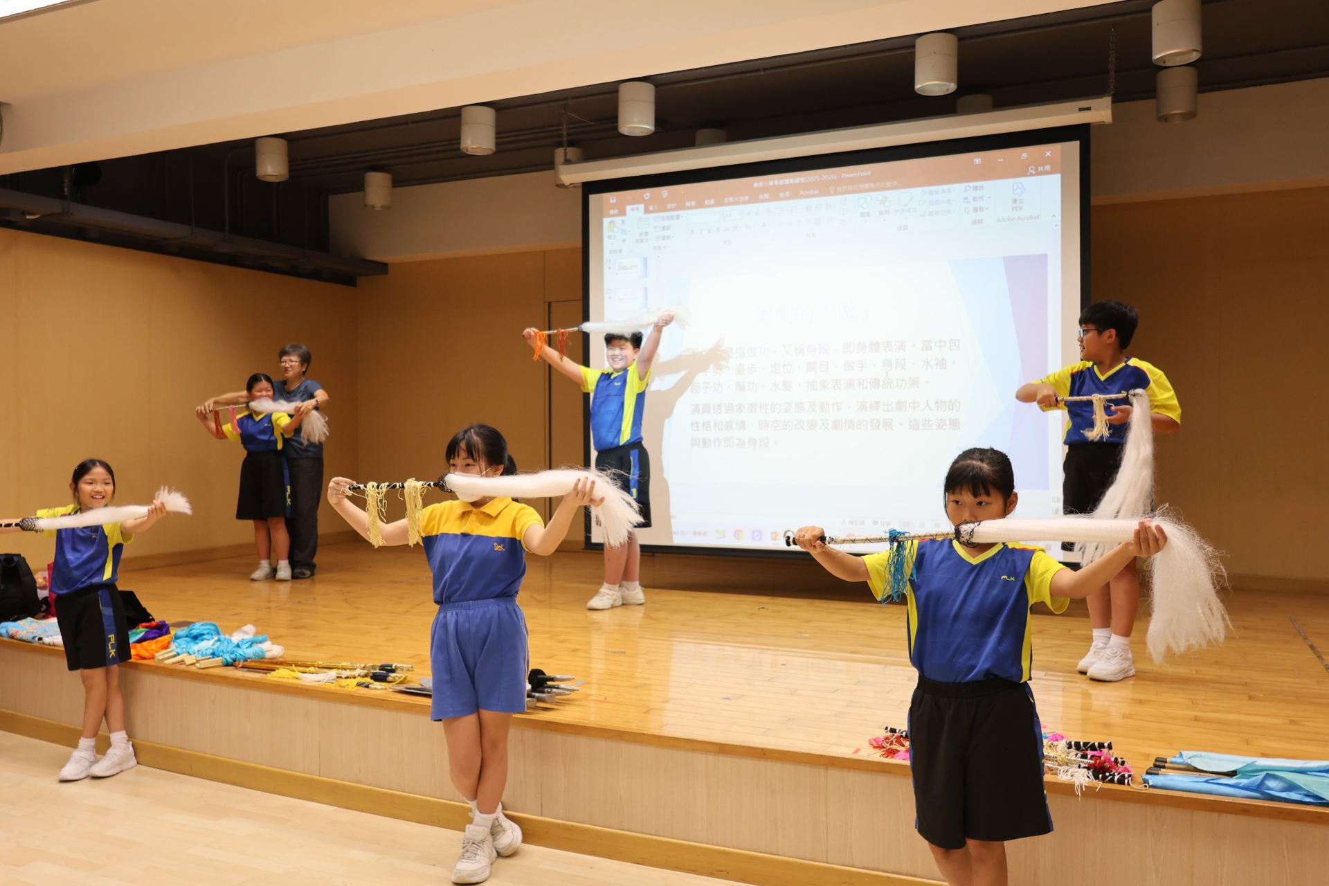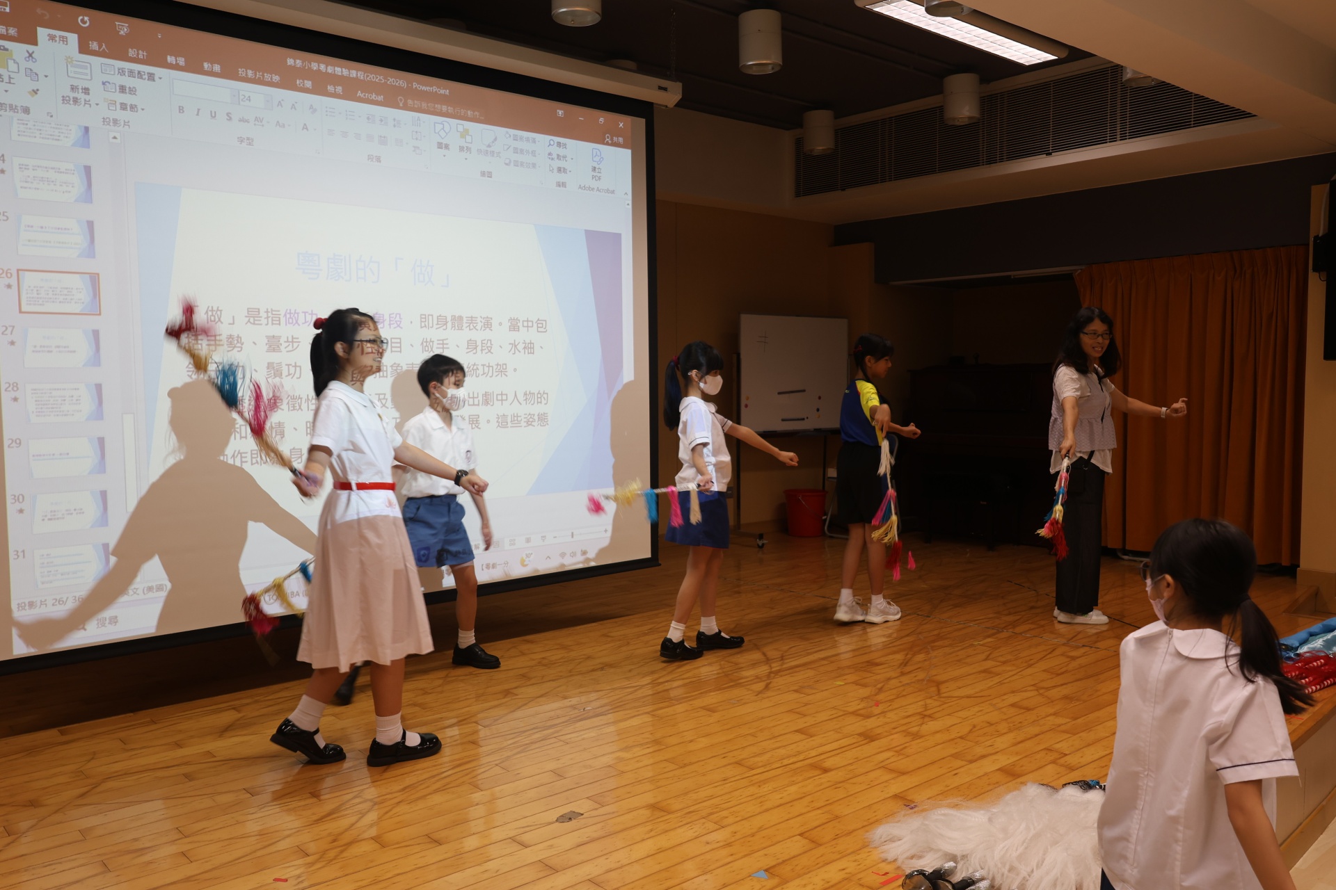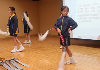 粵劇是以粵語演唱和念白的戲曲。課程中學生可以學習到通過唱、做、唸、打的藝術手段,並會配合化妝、服飾、道具和鑼鼓等演繹故事情節,其表現形式糅合了文學、戲劇、曲藝、舞蹈及武打,它的唱腔、行當、化妝、身段及曲譜等都蘊含豐富的藝術價值。讓我們一起回顧五年級學生上粵劇體驗課時的課堂剪影吧!