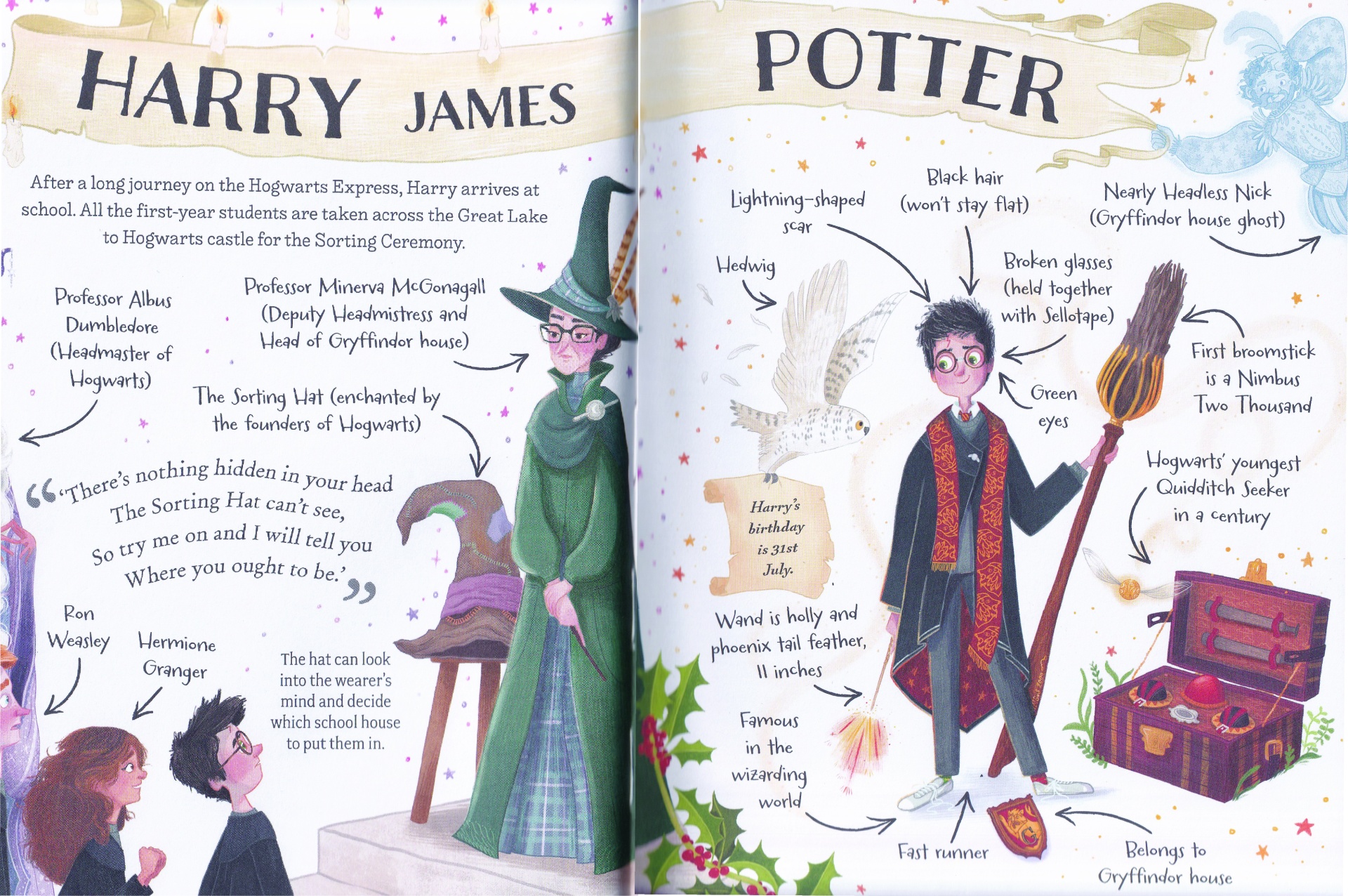 This book isn’t THE Harry Potter book. It’s different. It is shorter. It has fewer words. There are lots of lovely illustrations. The illustrations are drawn by Natalie Smillie. She is the illustrator.