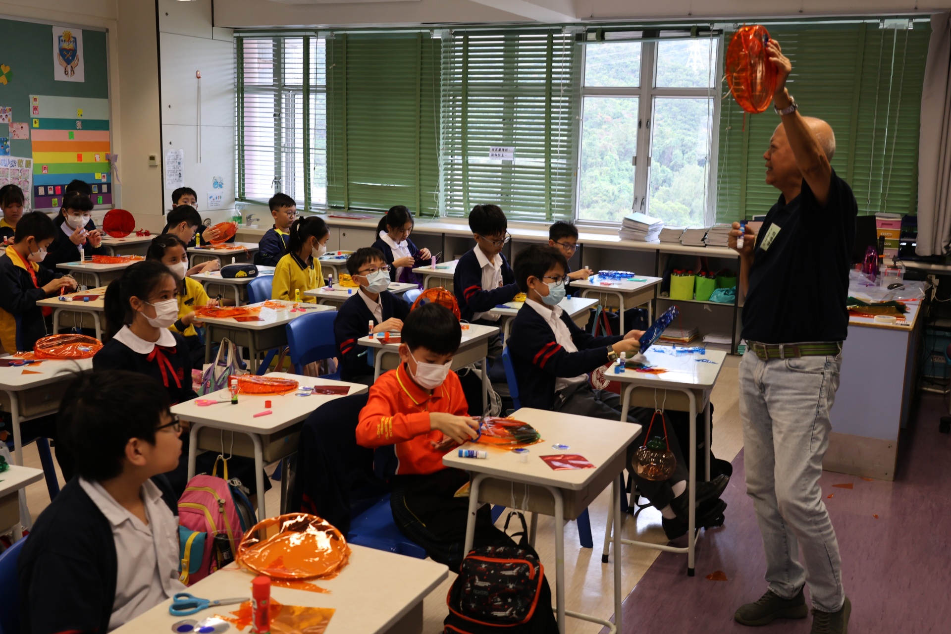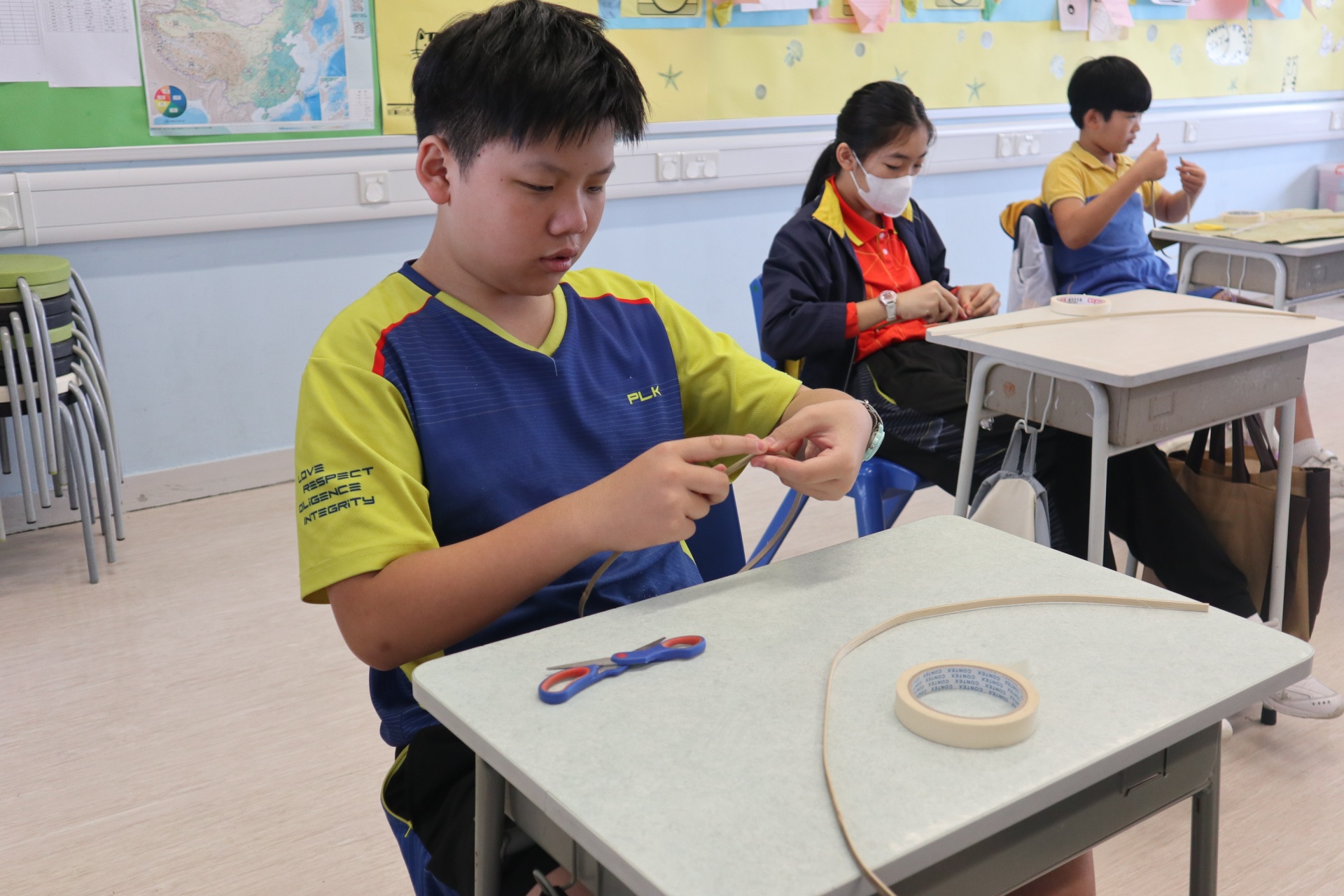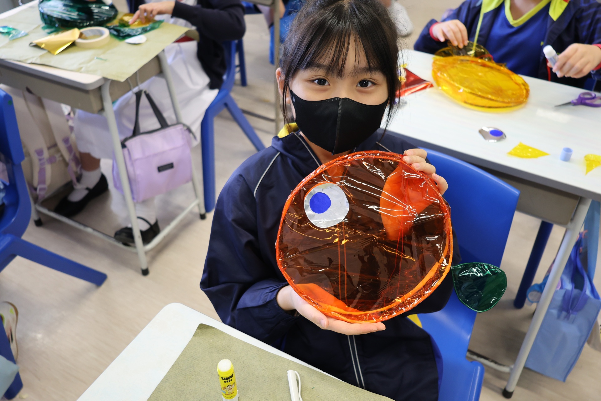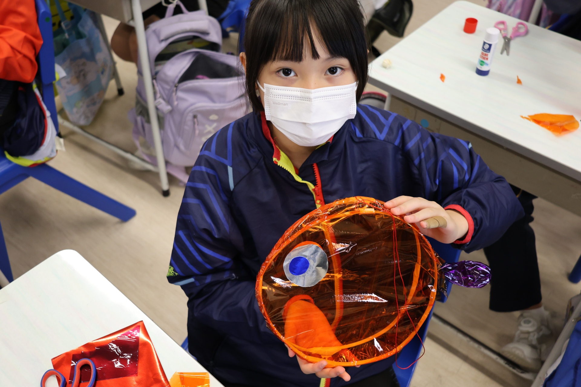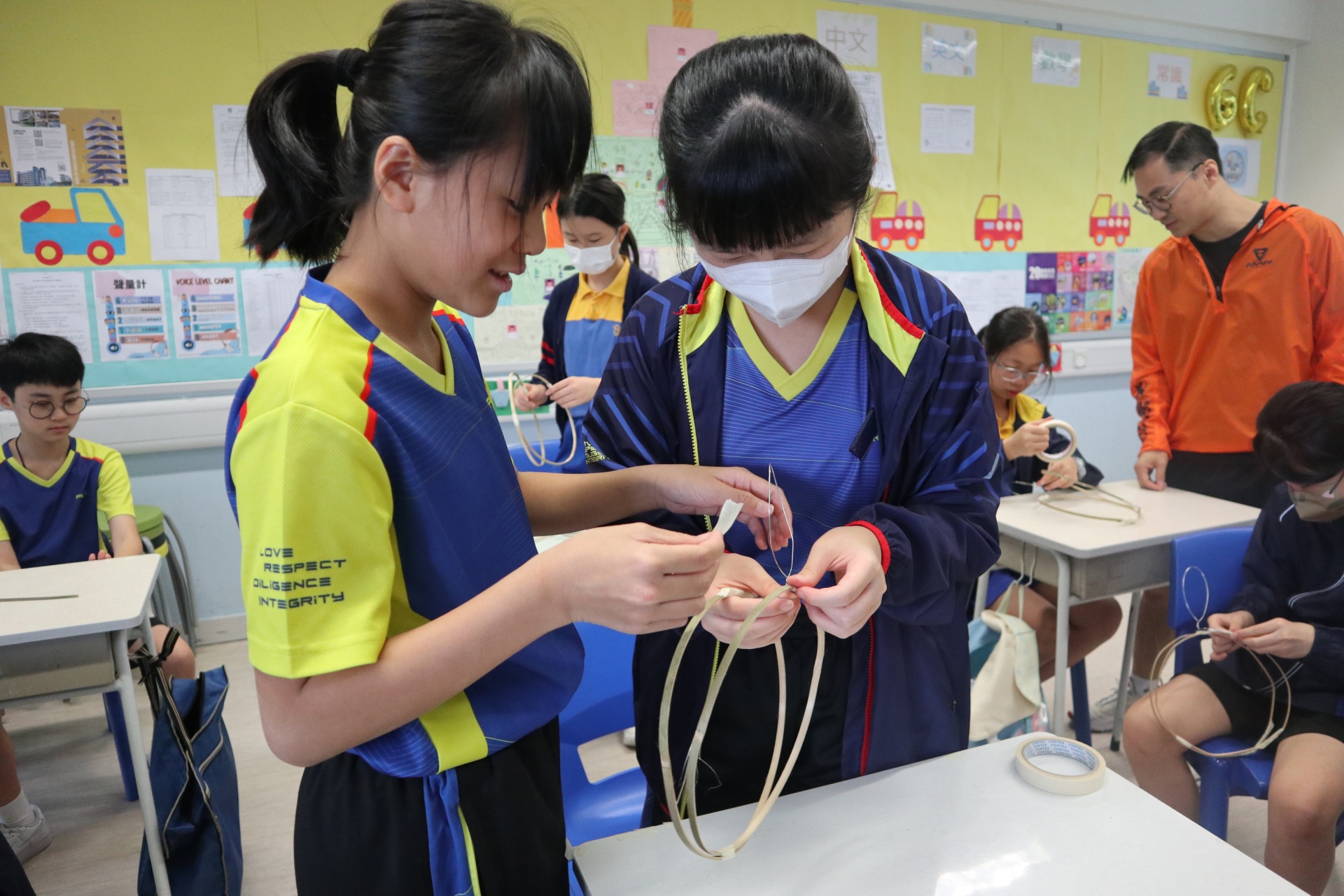 六年級學生將會於體驗課中學習紮骨、貼飾紙來創作一尾魚兒花燈。看,學生多麼投入創作呢!
