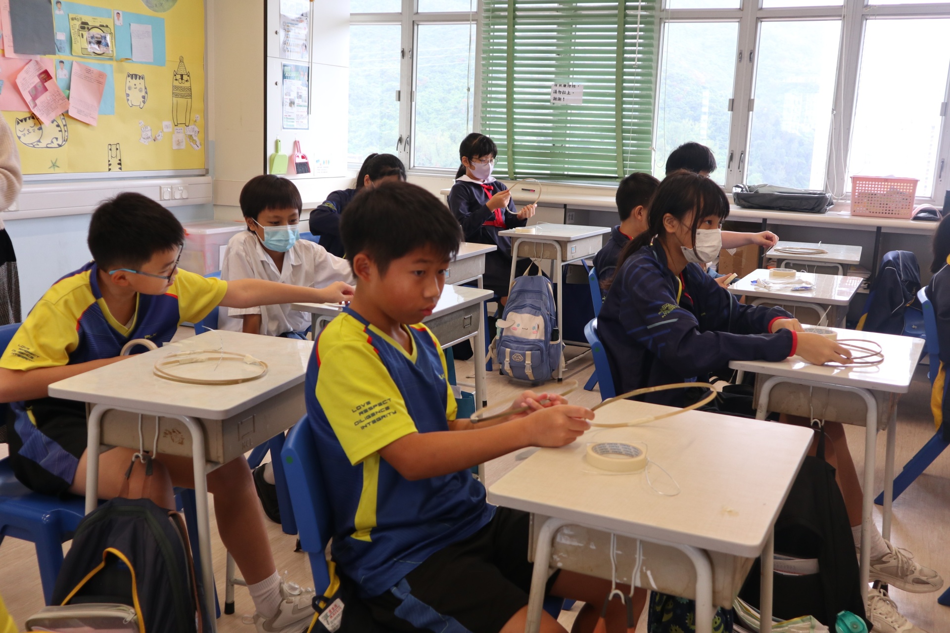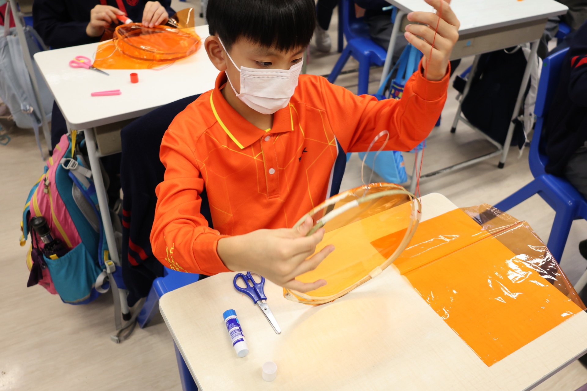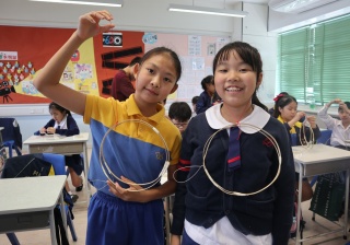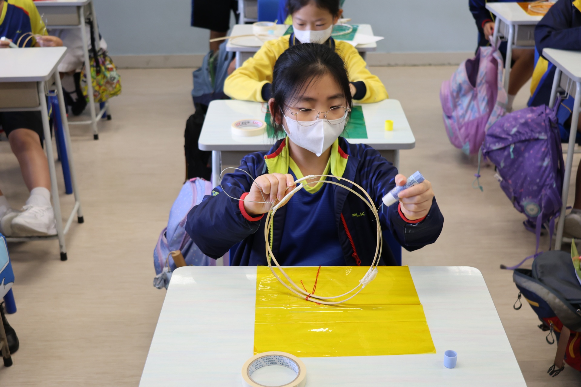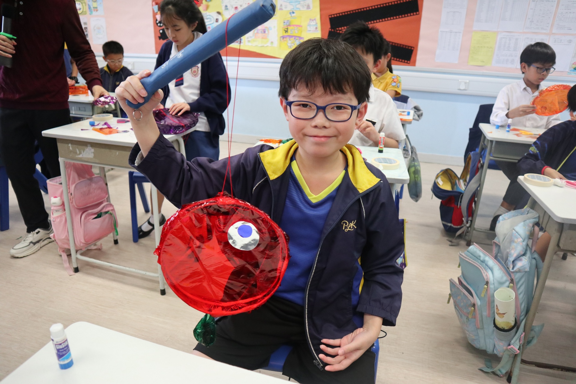 六年級學生將會於體驗課中學習紮骨、貼飾紙來創作一尾魚兒花燈。看,學生多麼投入創作呢!