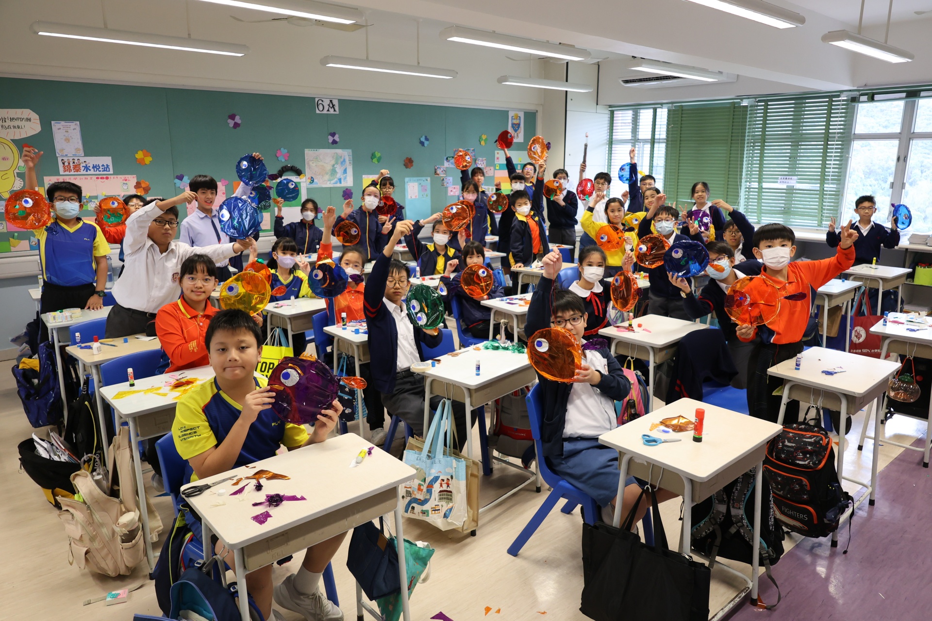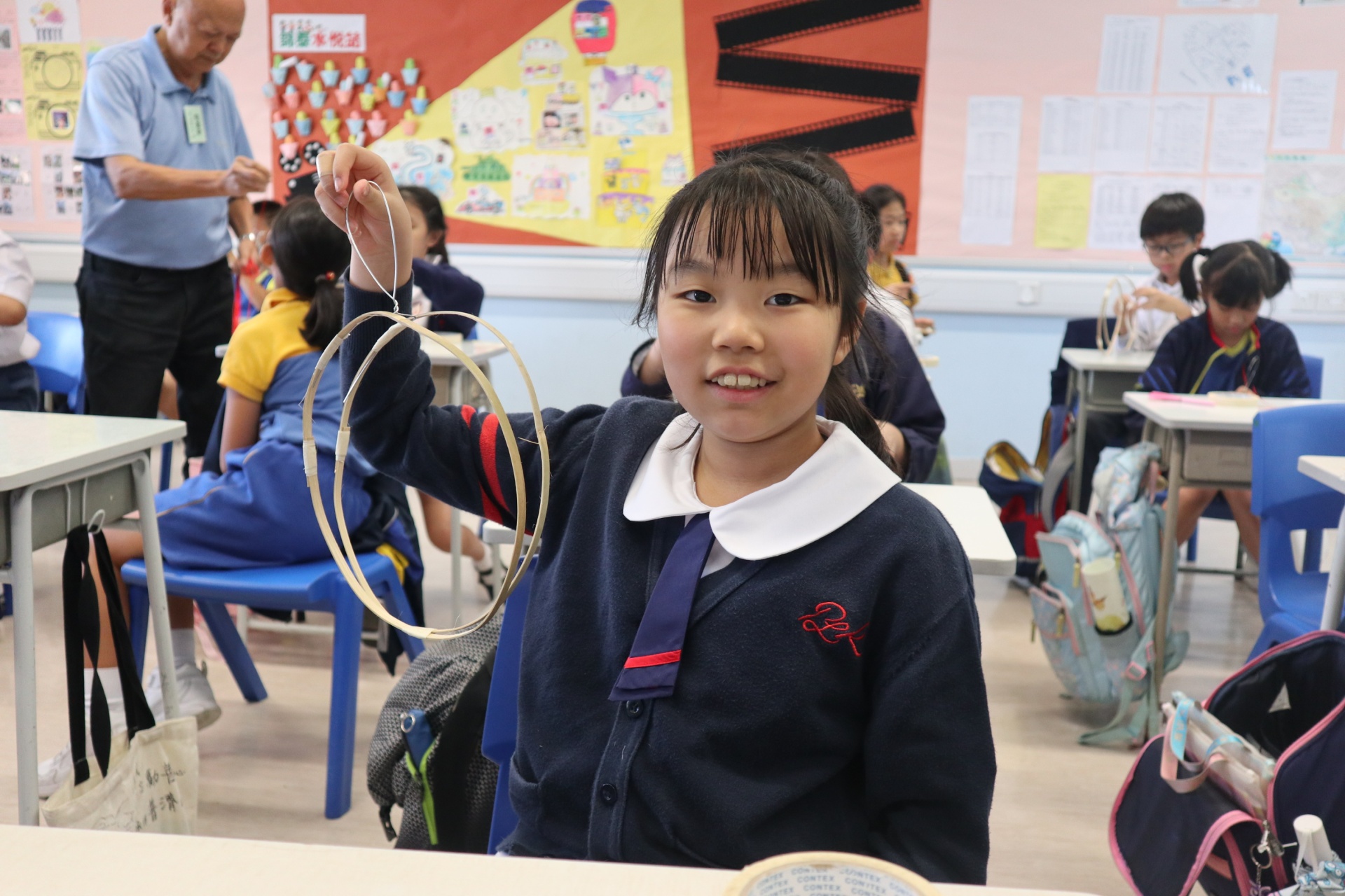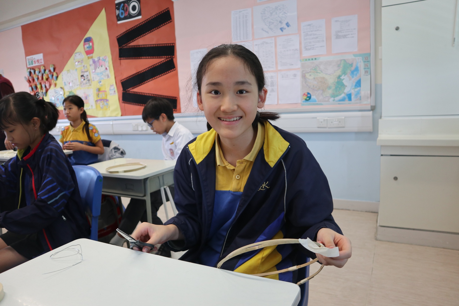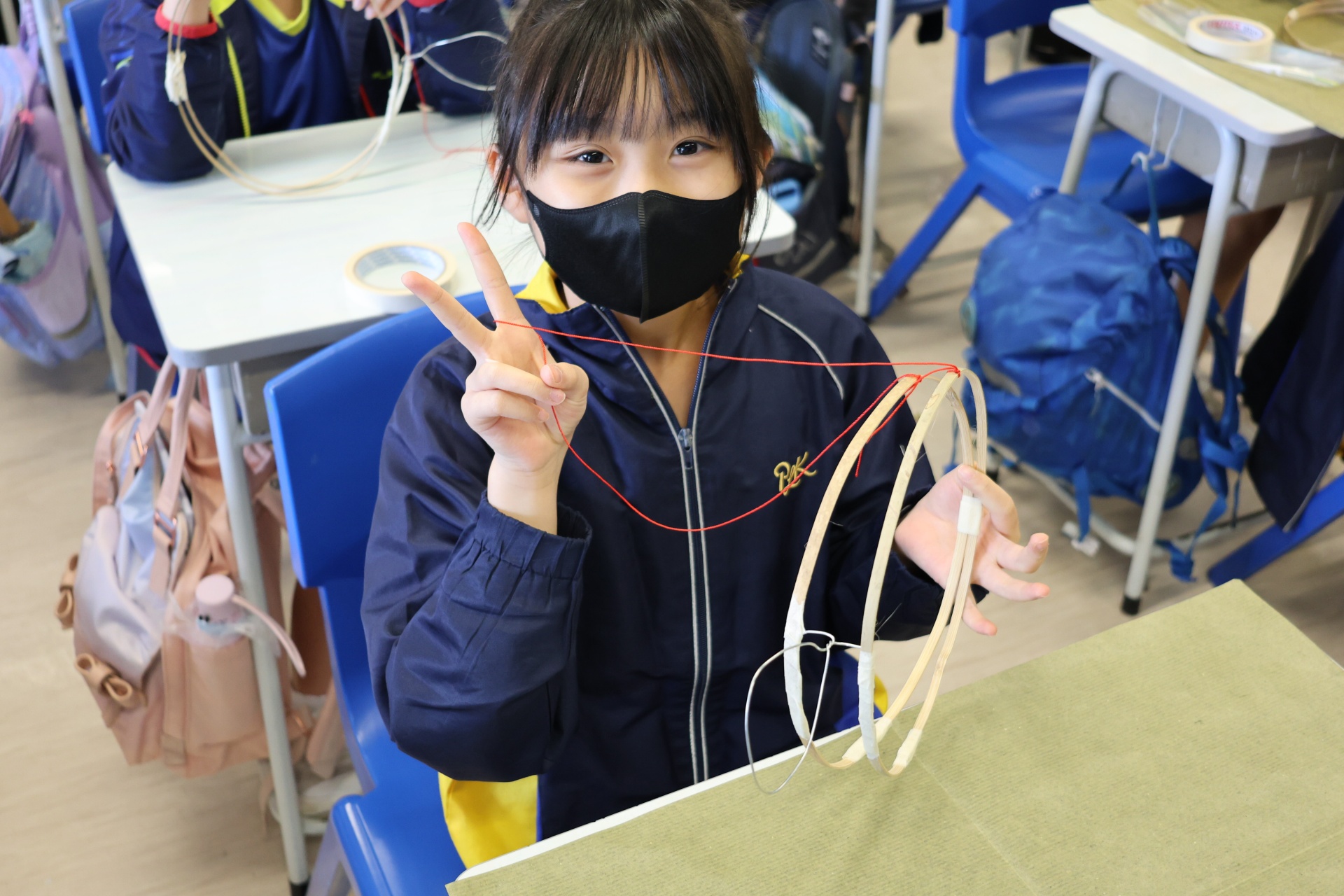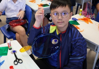六年級學生將會於體驗課中學習紮骨、貼飾紙來創作一尾魚兒花燈。看,學生多麼投入創作呢!