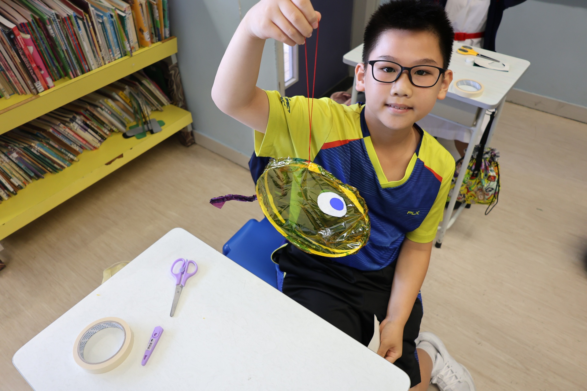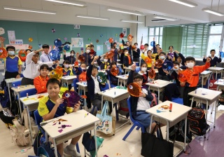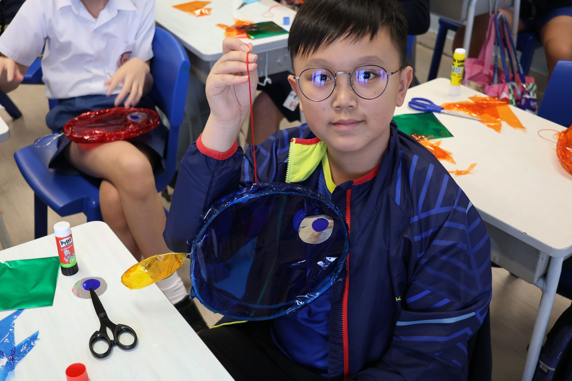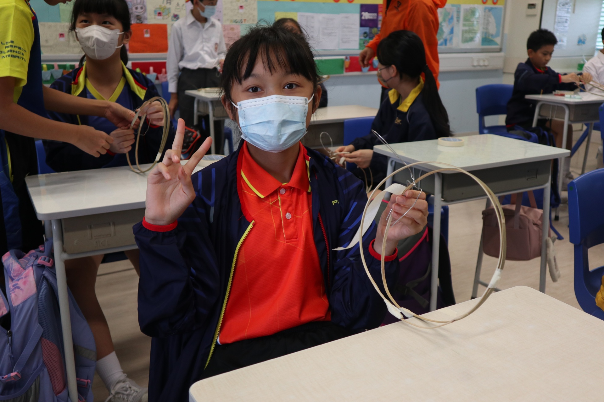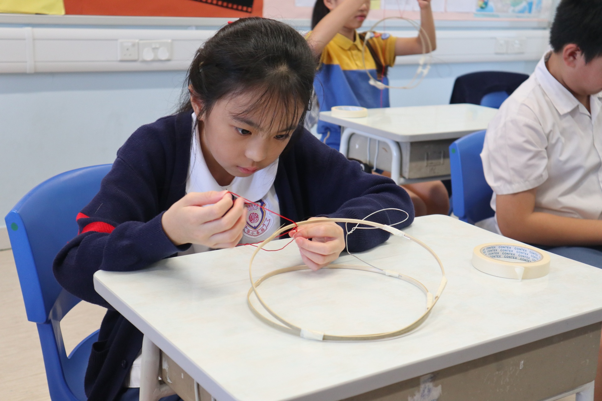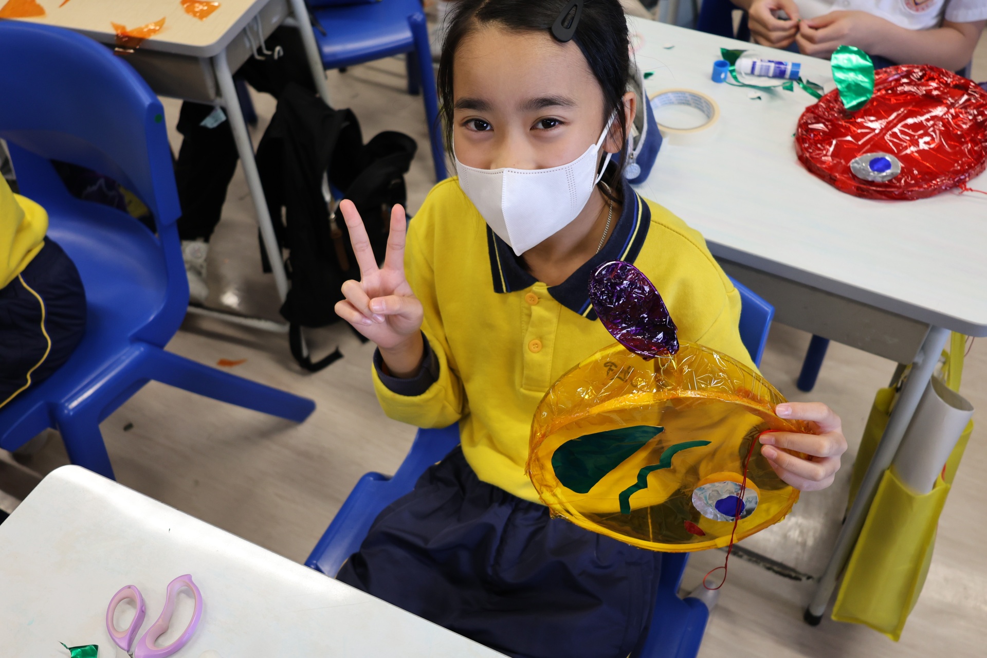 六年級學生將會於體驗課中學習紮骨、貼飾紙來創作一尾魚兒花燈。看,學生多麼投入創作呢!