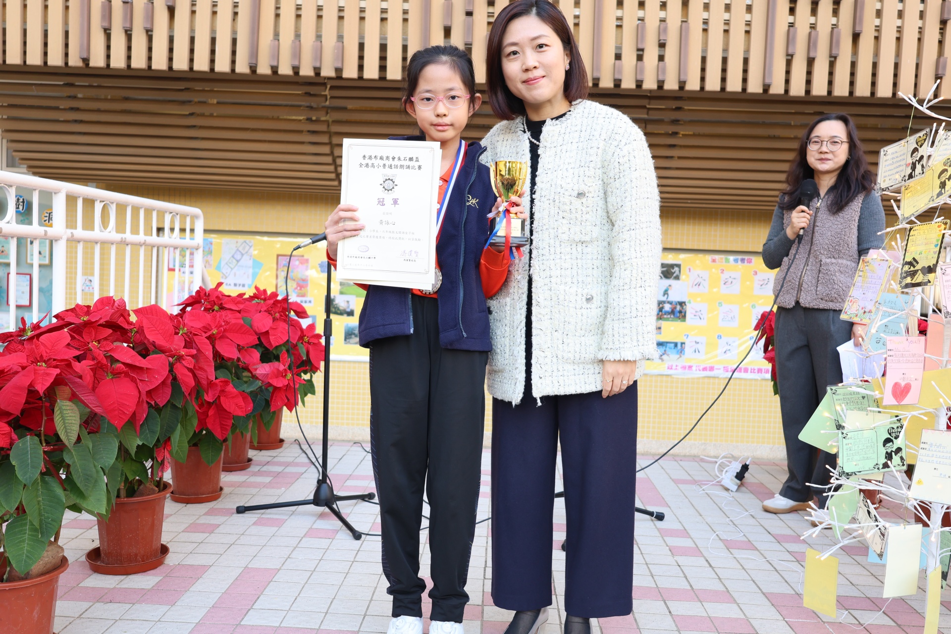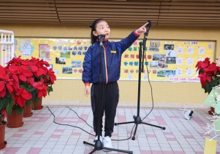 12月16日(星期二)早上為普通話日早會,精彩的節目給全校師生們留下了深刻印象。首先,是普通話口才訓練班的三位同學用一個短話劇演繹了周訓主題「創造力」。原來,只需要將腦中的奇思妙想勇敢地表達出來,就能打開「創造力」魔力盒啊!其次,兩位5A同學郭幸兒、楊玥瑩帶來的相聲《反正話》逗得全場哈哈大笑。兩位同學自然大方的表演,贏得一眾老師的稱讚。而2E班葉美琳同學的朗誦表演同樣獲得大家的讚賞,別看她小小年紀,在舞台上表演一點兒也不怯場,並且是朗誦比賽的常勝將軍呢!最後,本校普通話科組早前推薦5B班黃詠心同學參加香港布廠商會朱石麟盃全港高小普通話朗誦比賽,黃同學不負眾望,榮獲小學五、六年級散文獨誦冠軍和詩詞獨誦優異獎,吳校長為黃同學頒獎。