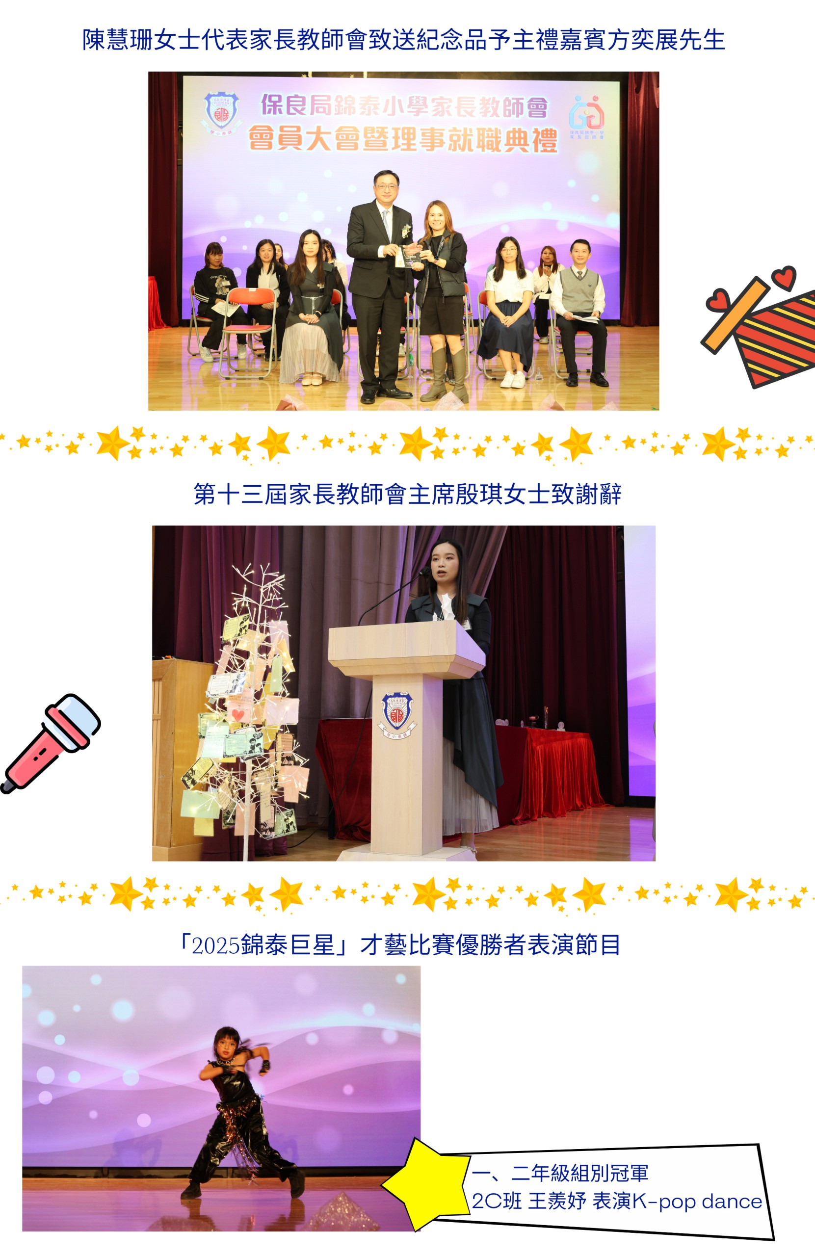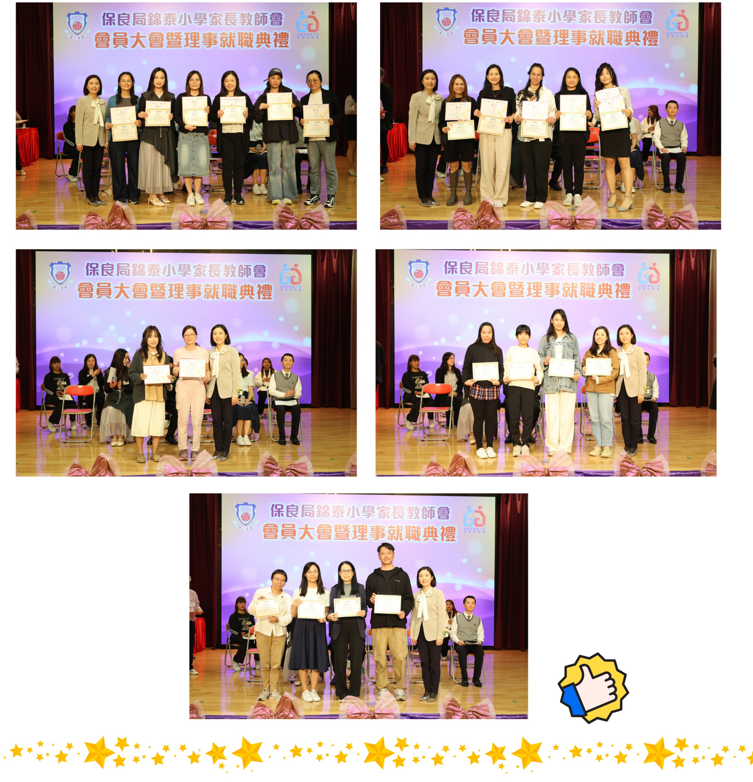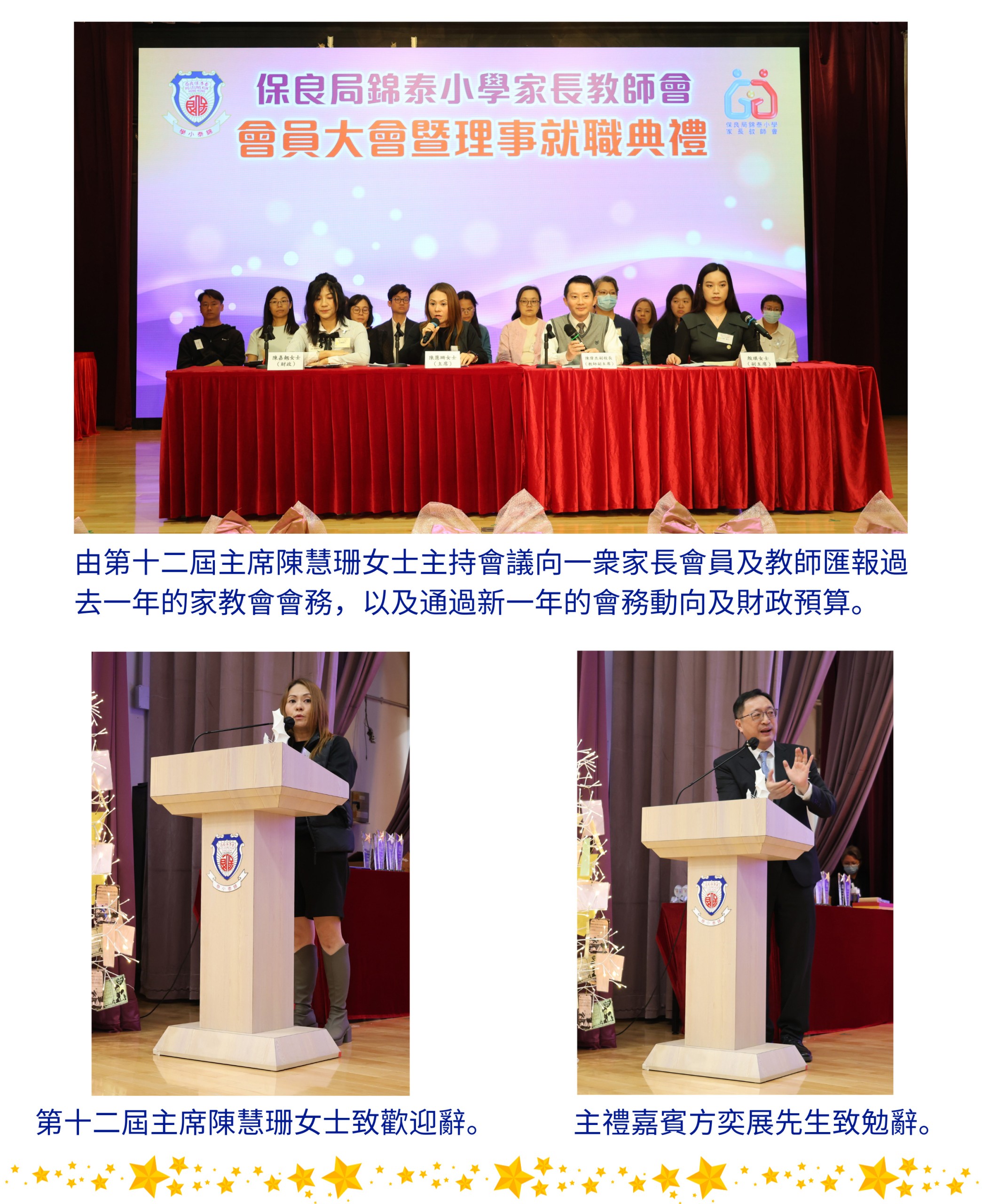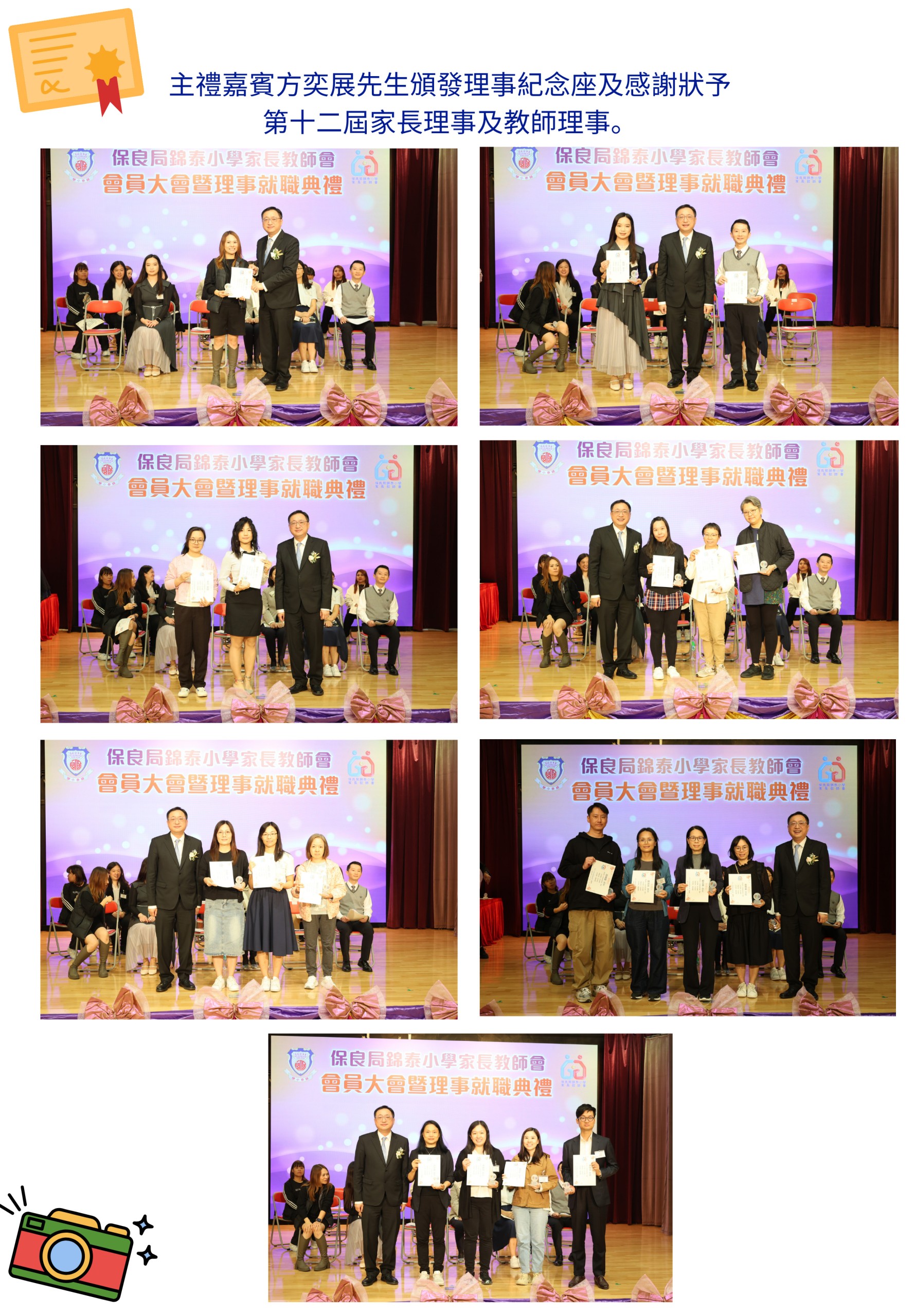 會上,家長教師會理事向會員及教師匯報過去一年的會務及財務情況,並公布新一屆理事名單,以及來年的會務方向與財政預算。典禮上頒發理事委任證書、家長義工感謝狀、香港義工獎及家教會舉辦之各項比賽獎項。