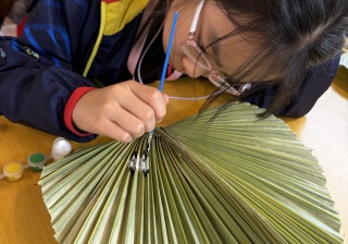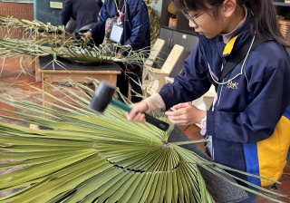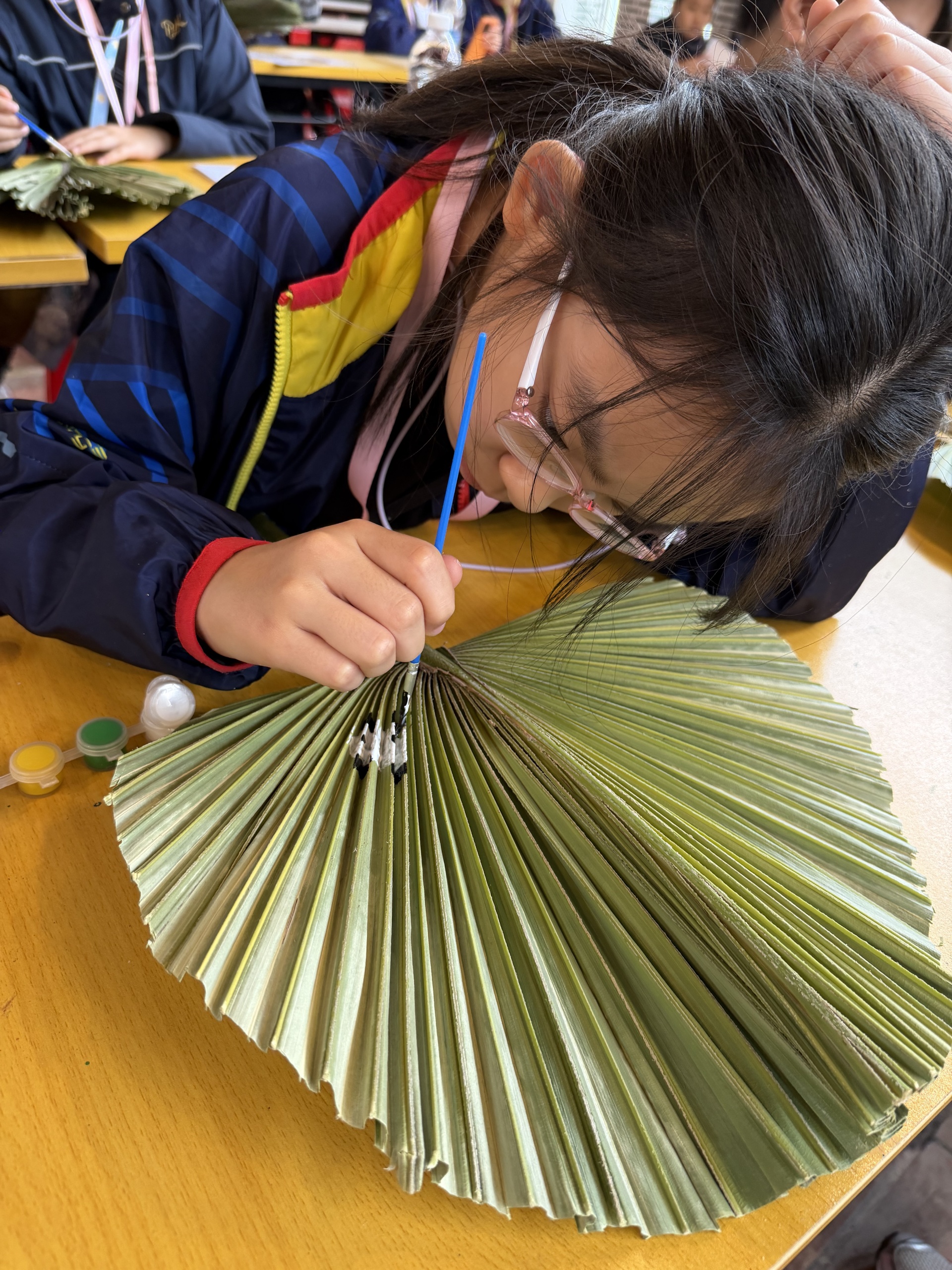 經過千餘年的探索,新會人已經將編織、繡花、繪畫和印花等工藝融為一體,使得葵藝產品獨樹一幟。同學們在此親自體驗了一次葵扇的製作。首先,同學們需將一個完好的蒲葵通過捶打和修剪,製作出各種形狀的蒲扇。然後,在蒲扇上畫上自己喜歡的圖案,就做成一把漂亮的蒲扇了。別看程序簡單,但實際操作可不容易,光是那大鐵鎚都有好幾斤重呢。