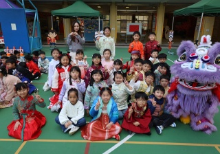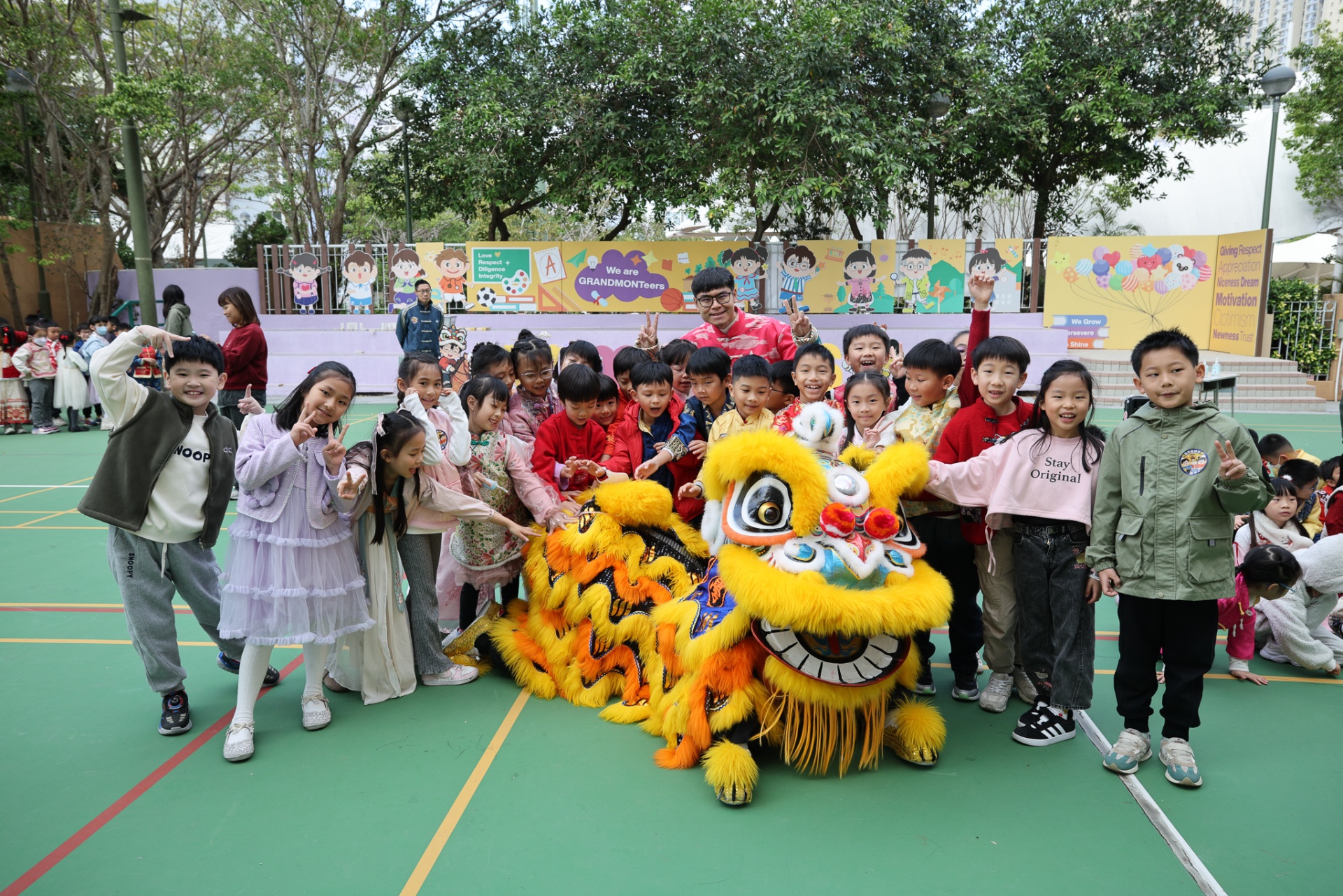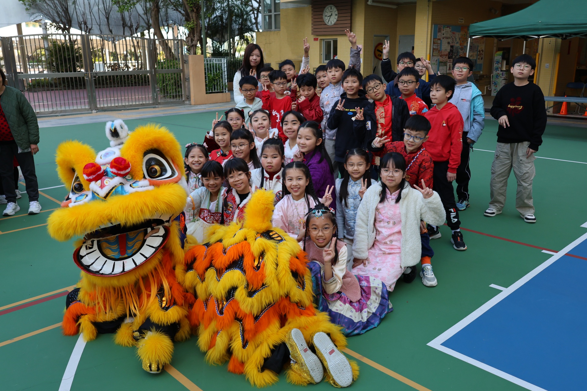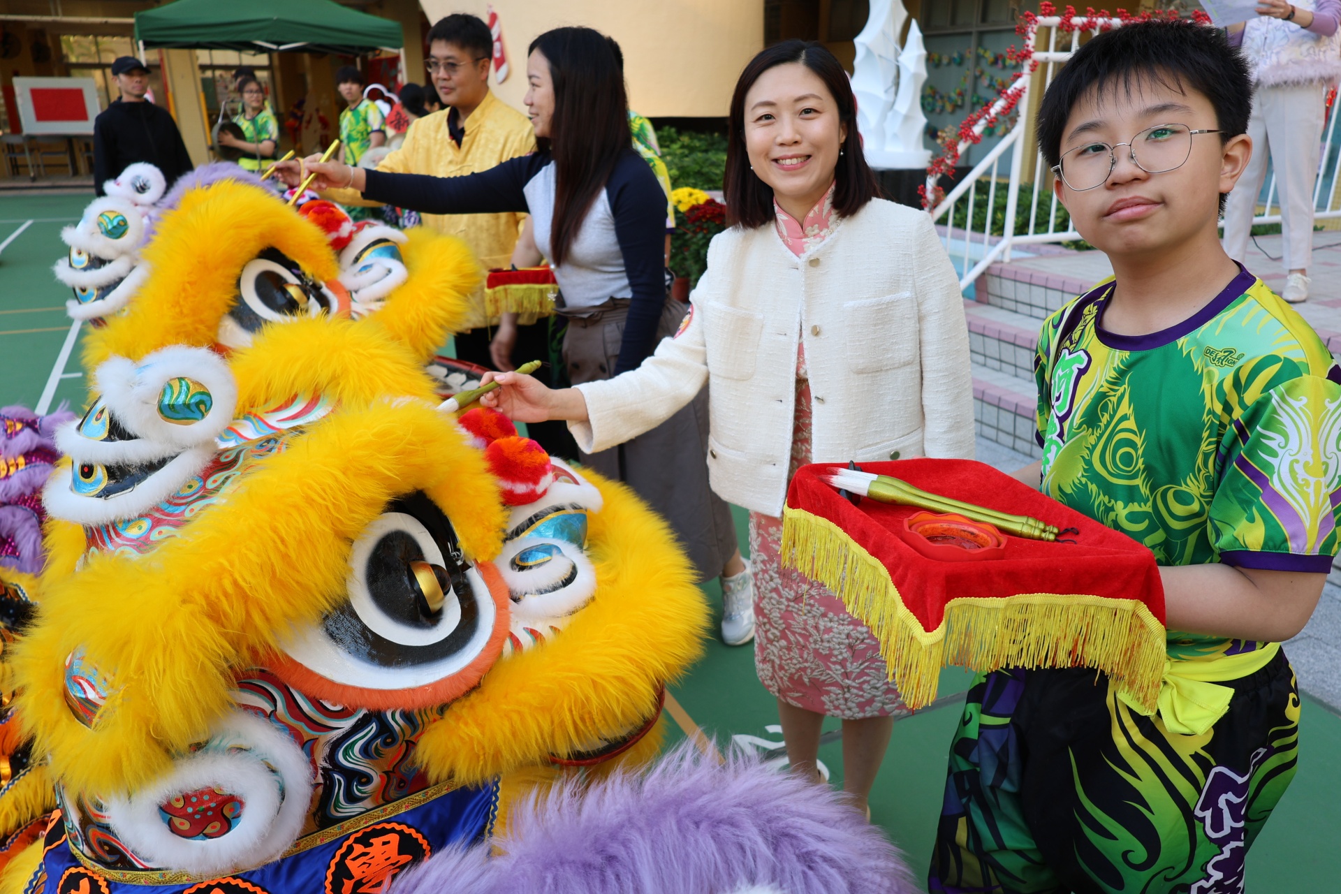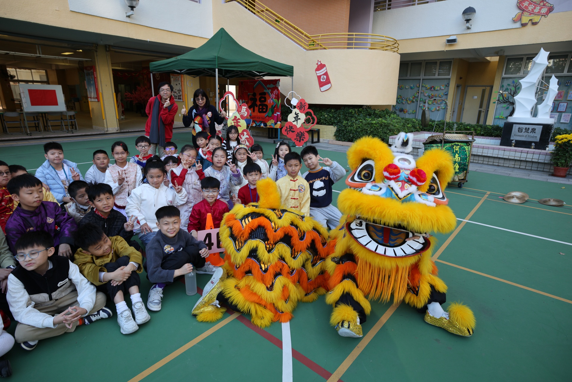 本校邀請到佛教何南金中學的舞獅隊到校表演。活動伊始,吳校長、劉副校長與家教會主席手持朱砂筆,為威風凜凜的醒獅點睛開光。醒獅活躍地在操場上翻騰跳躍。活動尾聲,舞獅隊與同學們歡樂合照,大家爭相觸摸獅頭沾取好運。