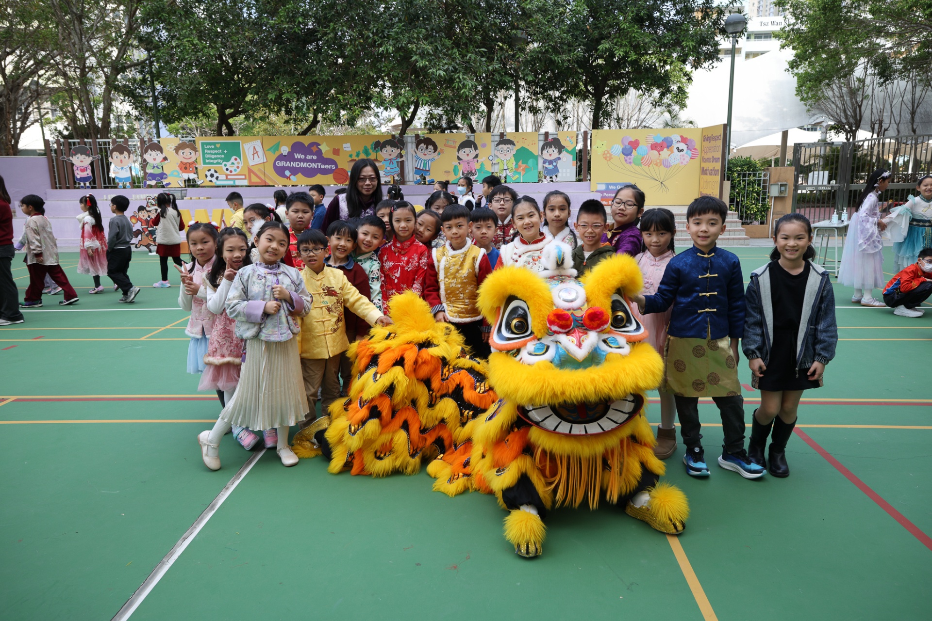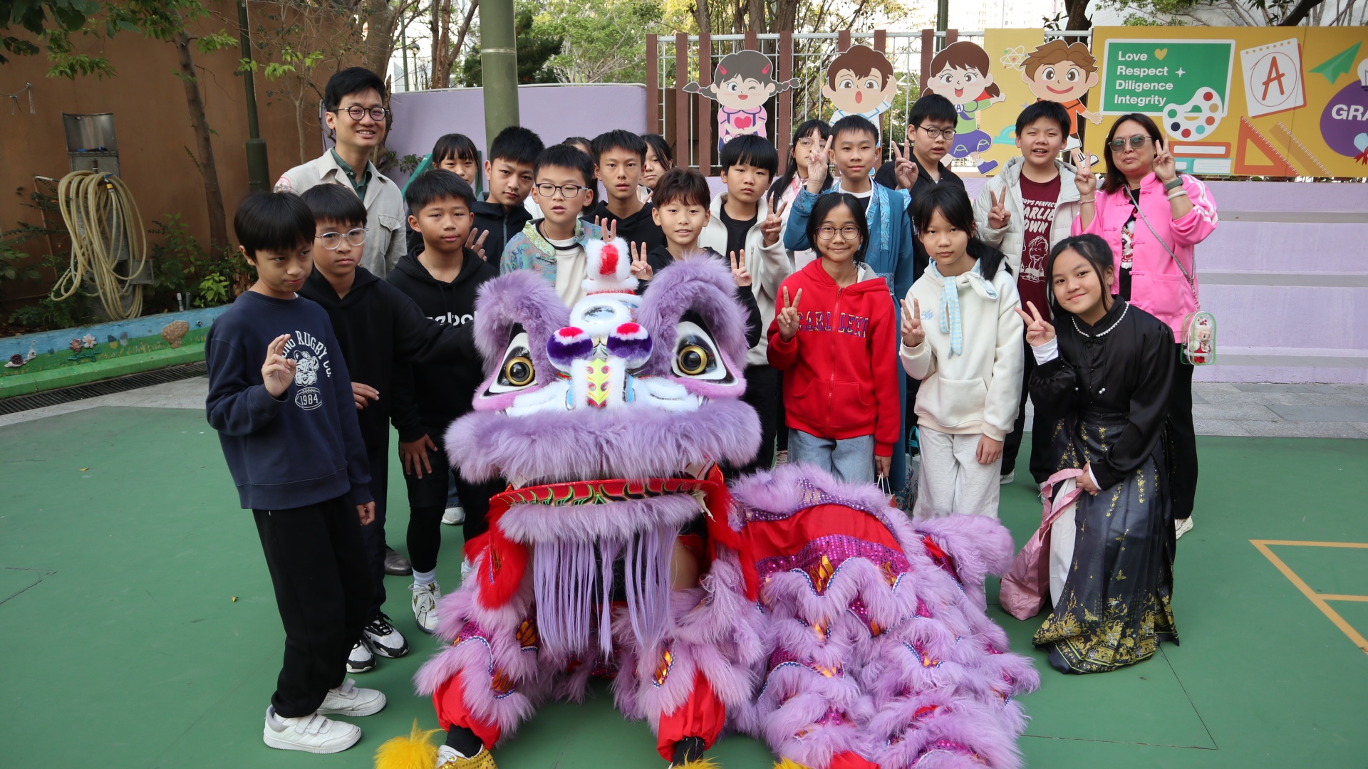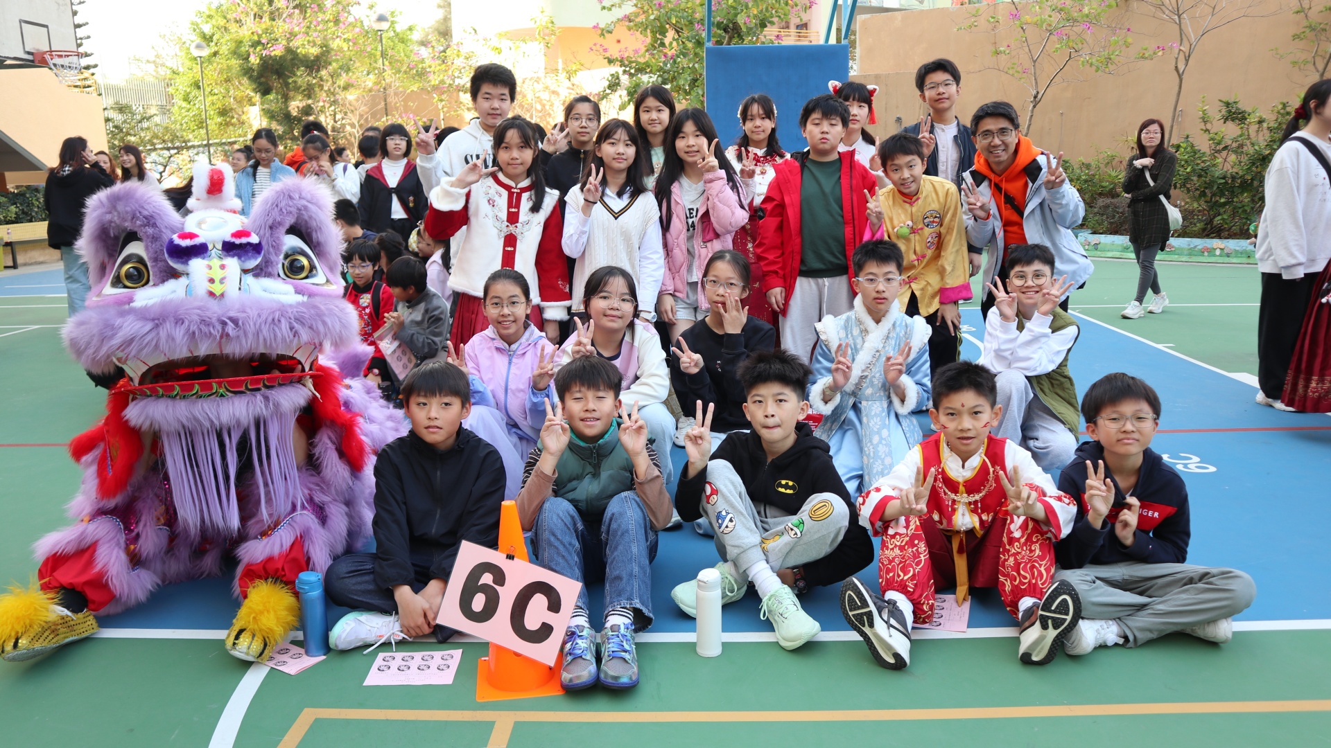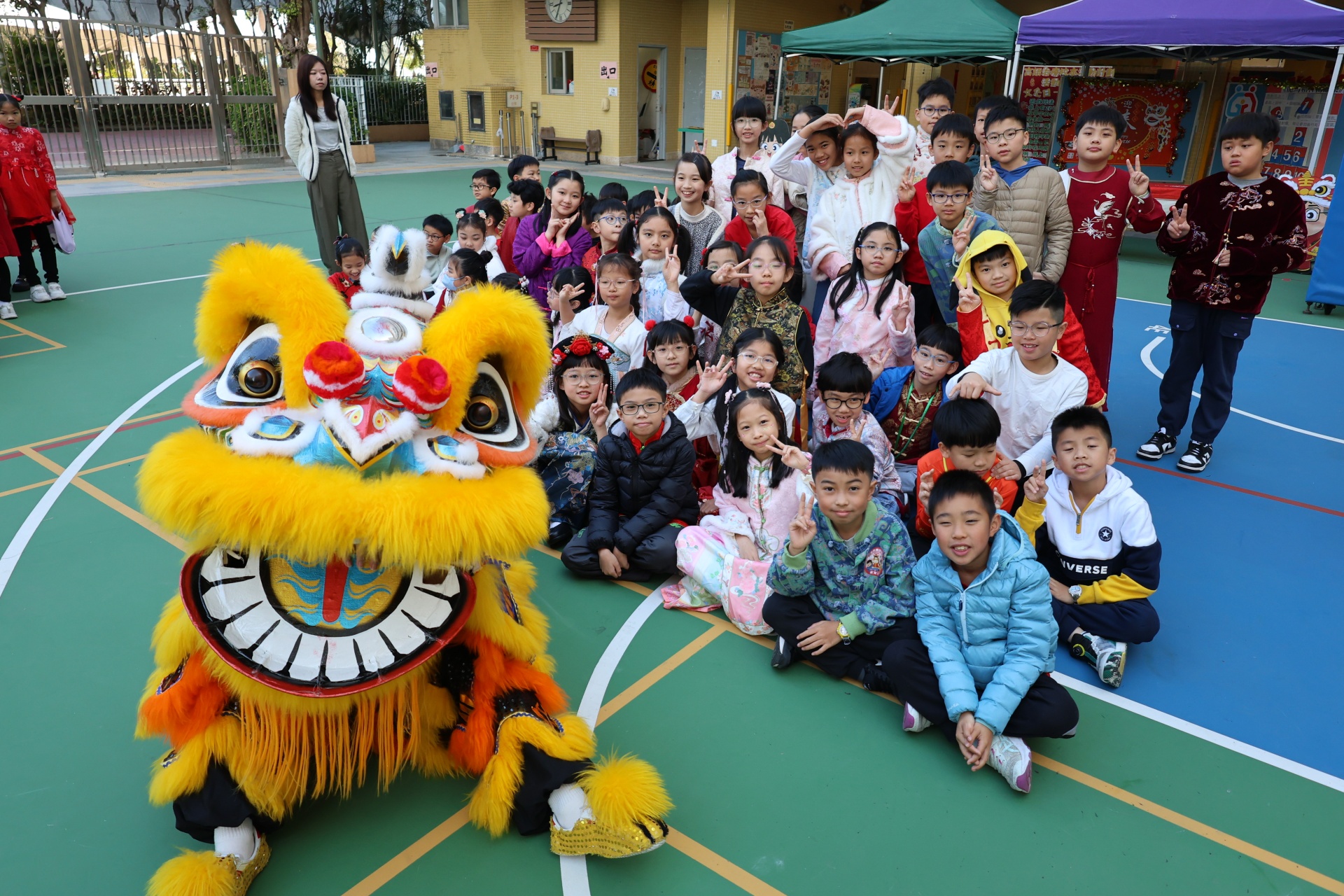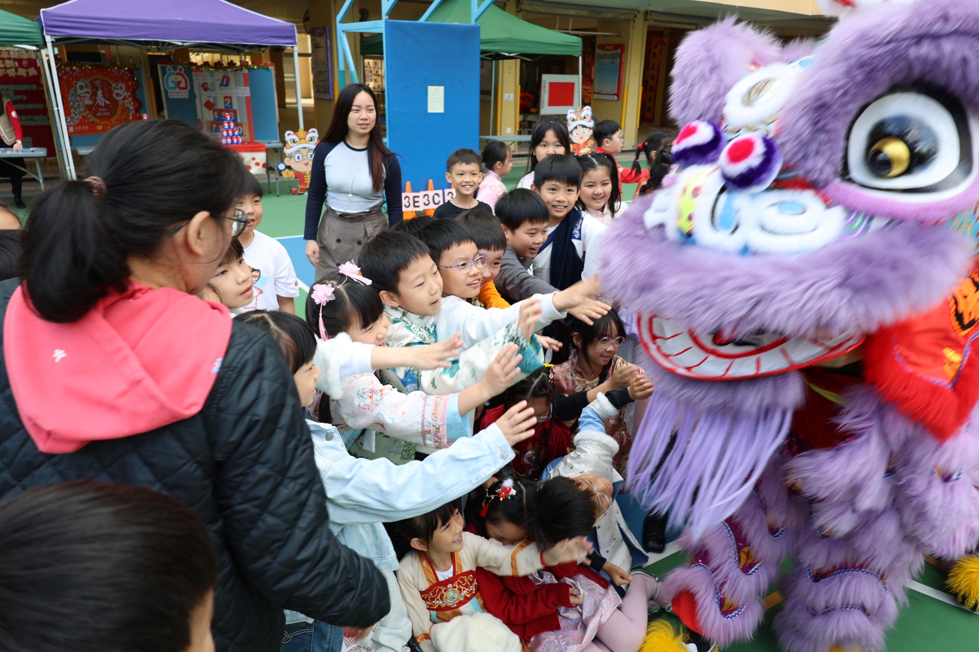 本校邀請到佛教何南金中學的舞獅隊到校表演。活動伊始,吳校長、劉副校長與家教會主席手持朱砂筆,為威風凜凜的醒獅點睛開光。醒獅活躍地在操場上翻騰跳躍。活動尾聲,舞獅隊與同學們歡樂合照,大家爭相觸摸獅頭沾取好運。