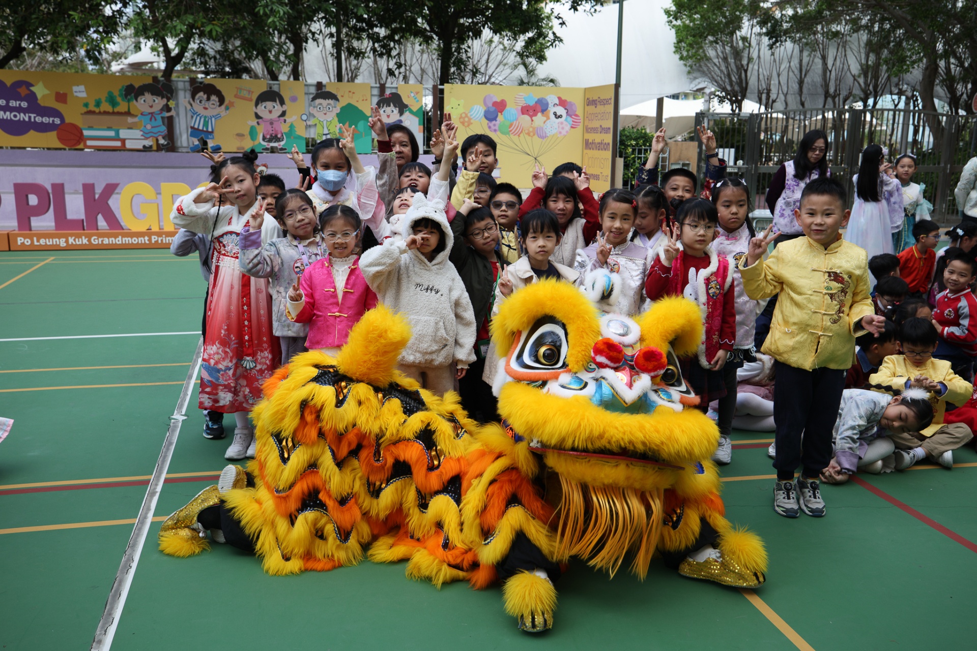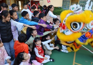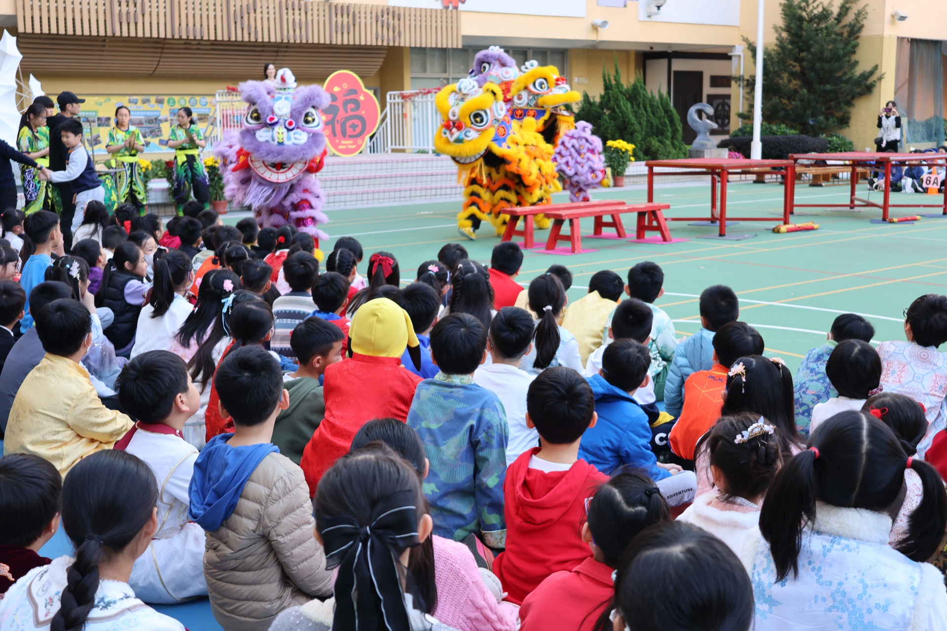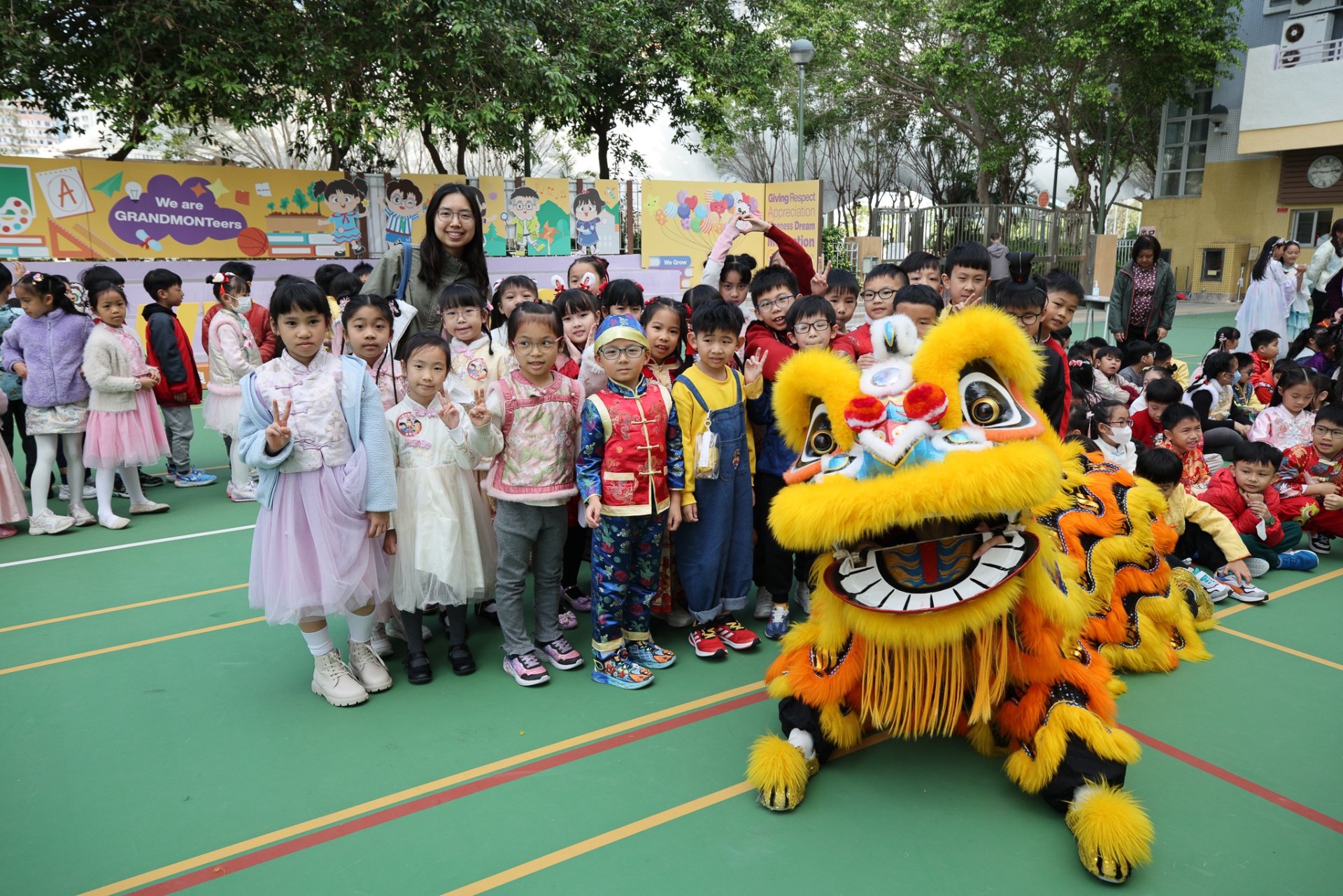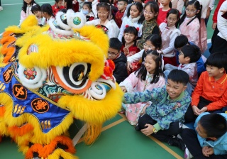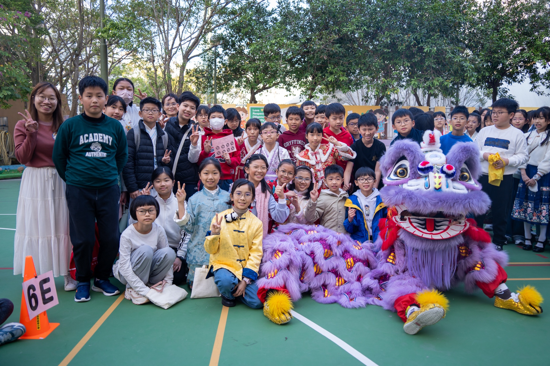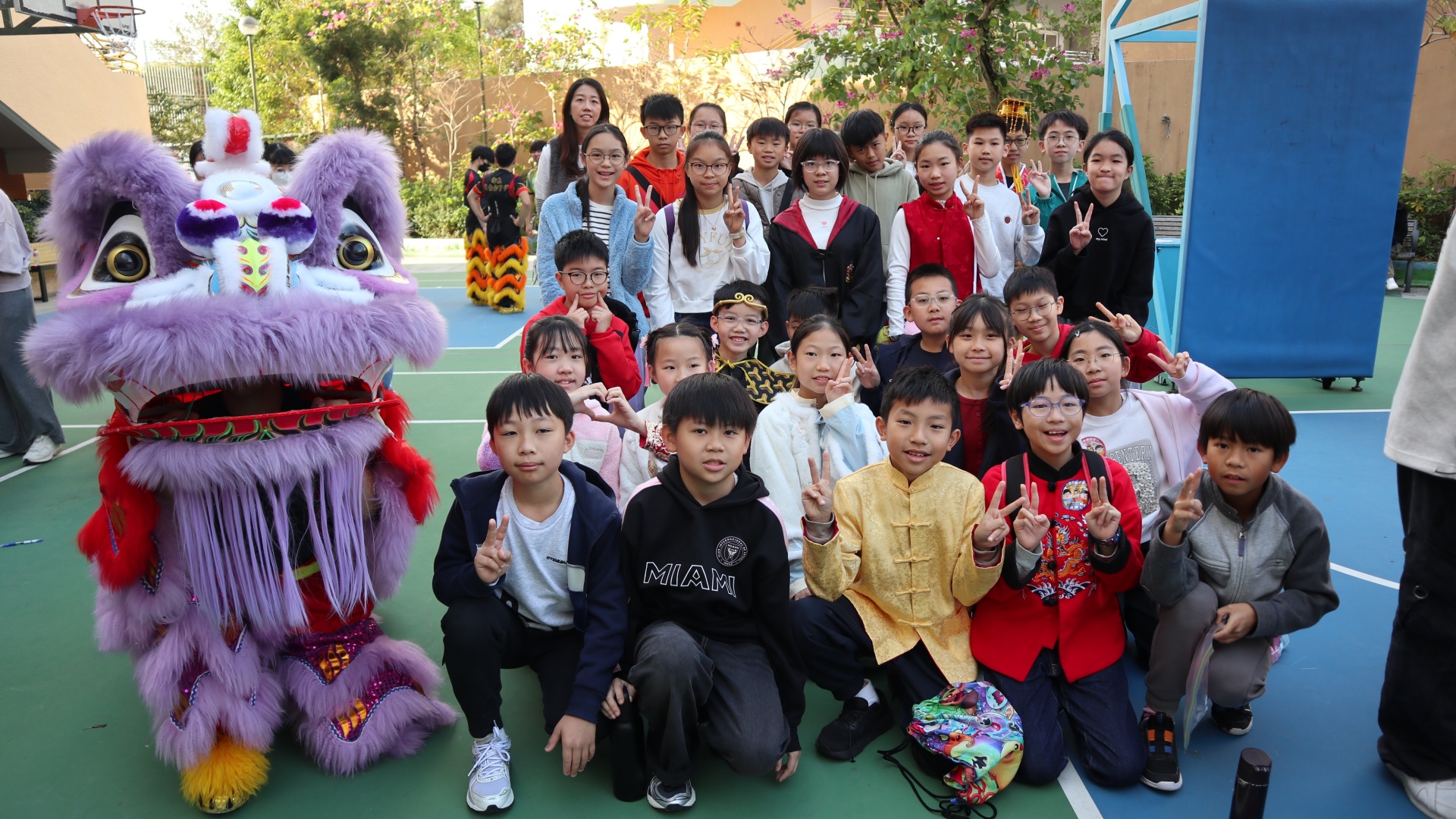 本校邀請到佛教何南金中學的舞獅隊到校表演。活動伊始,吳校長、劉副校長與家教會主席手持朱砂筆,為威風凜凜的醒獅點睛開光。醒獅活躍地在操場上翻騰跳躍。活動尾聲,舞獅隊與同學們歡樂合照,大家爭相觸摸獅頭沾取好運。