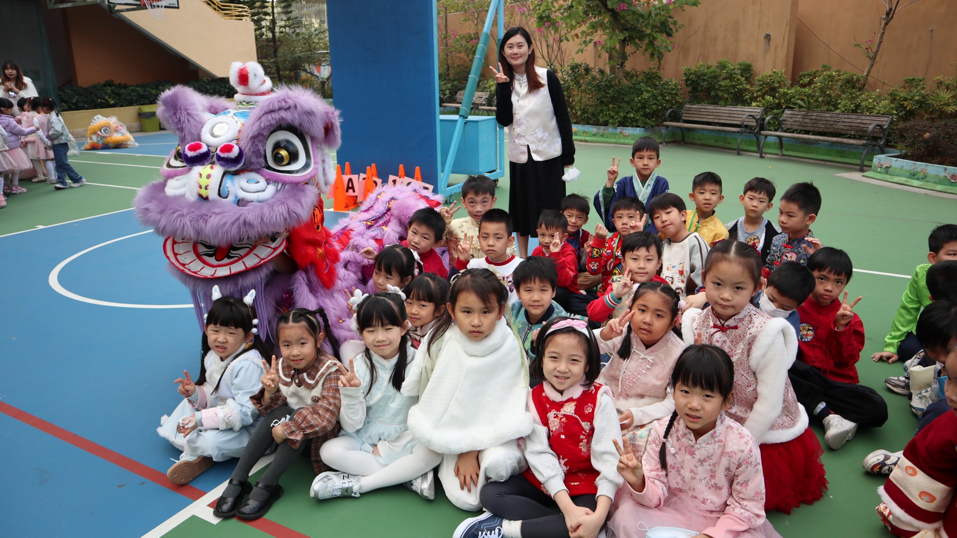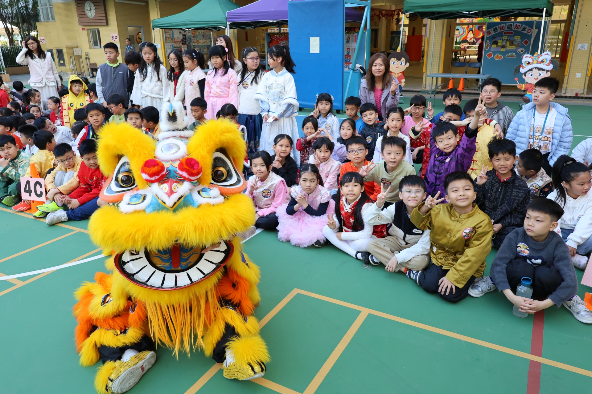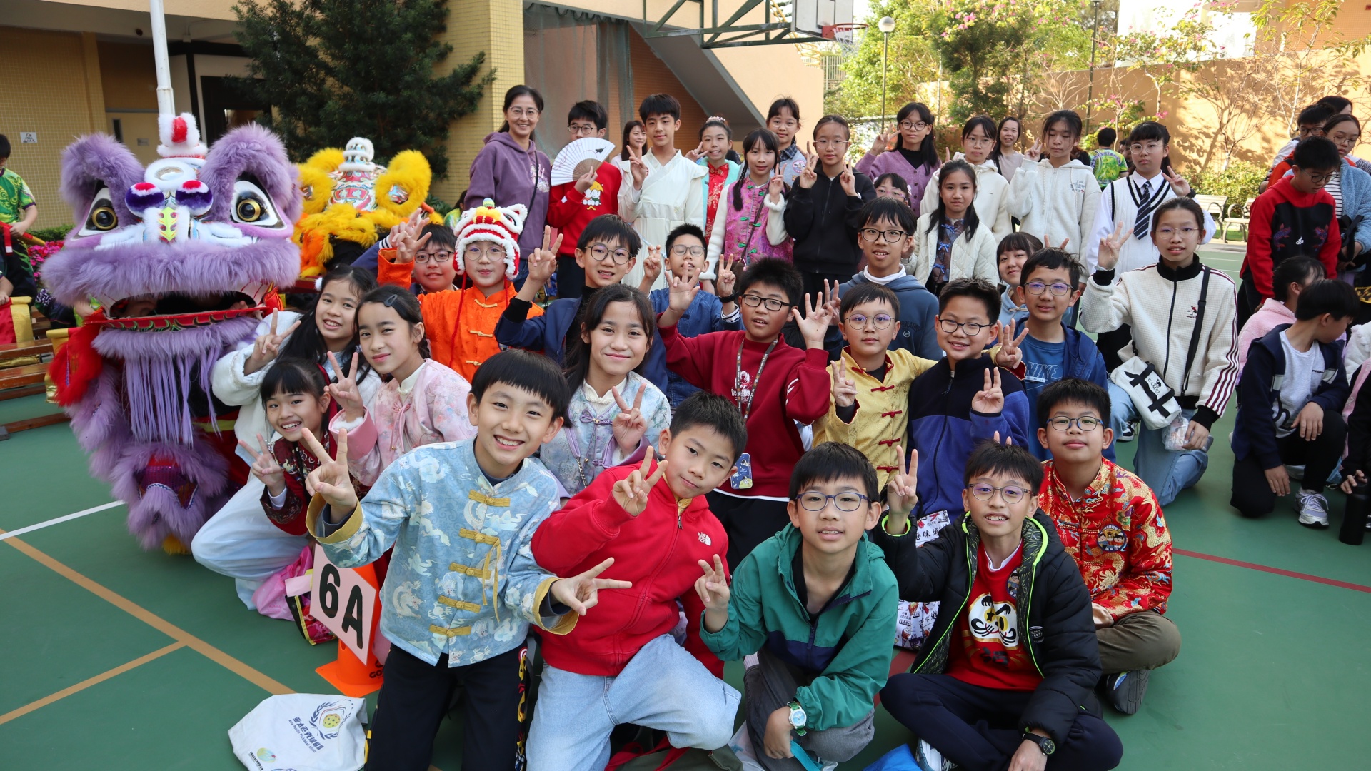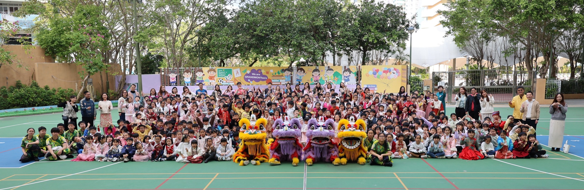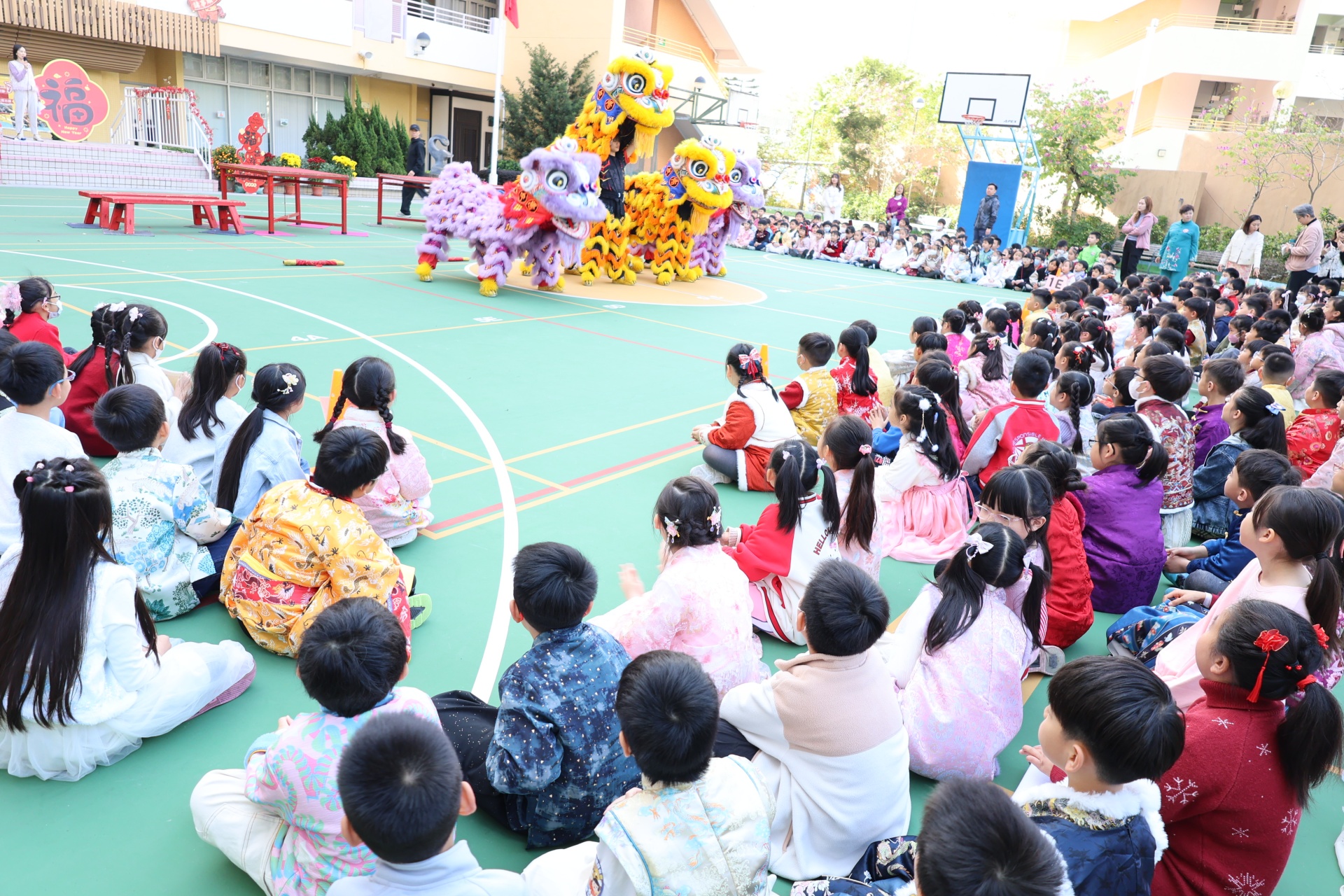 本校邀請到佛教何南金中學的舞獅隊到校表演。活動伊始,吳校長、劉副校長與家教會主席手持朱砂筆,為威風凜凜的醒獅點睛開光。醒獅活躍地在操場上翻騰跳躍。活動尾聲,舞獅隊與同學們歡樂合照,大家爭相觸摸獅頭沾取好運。