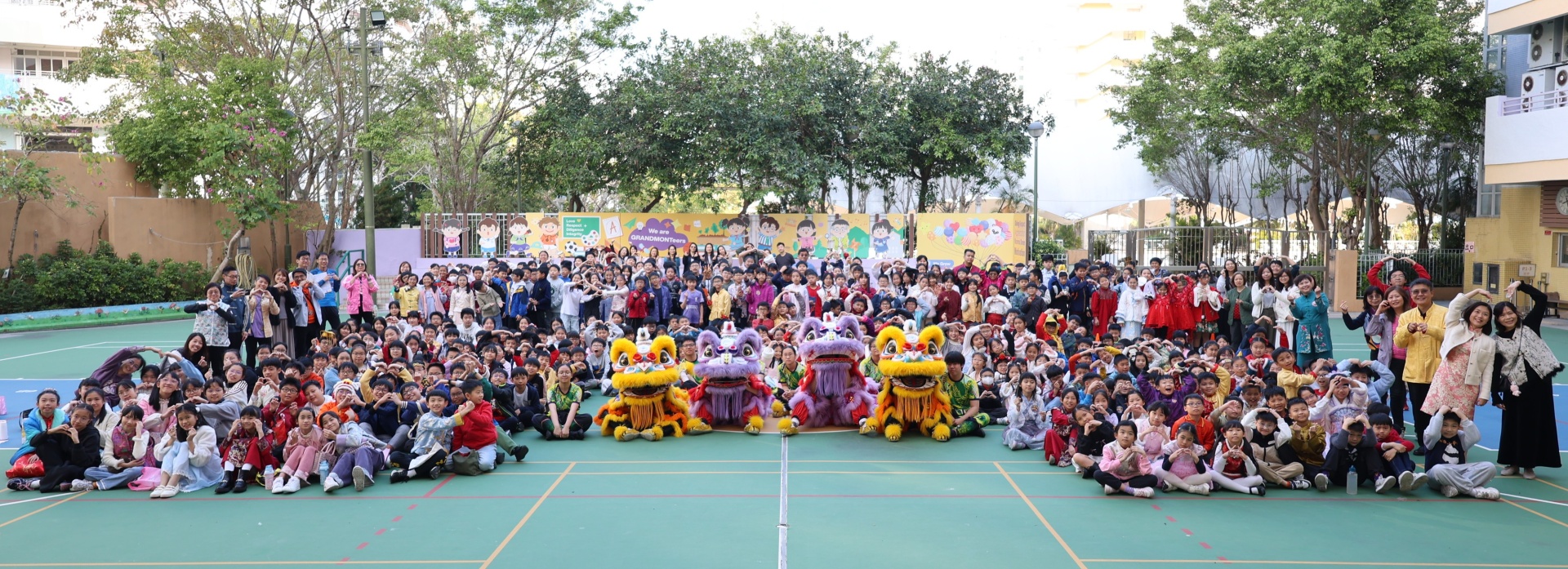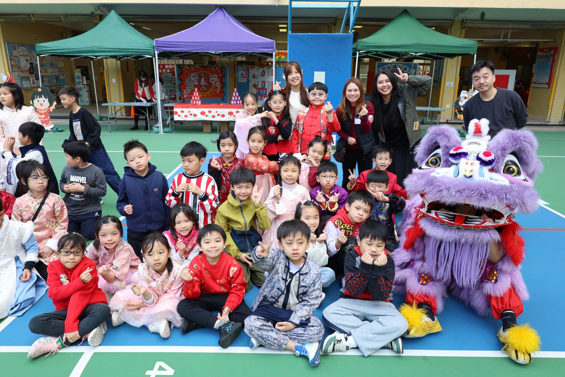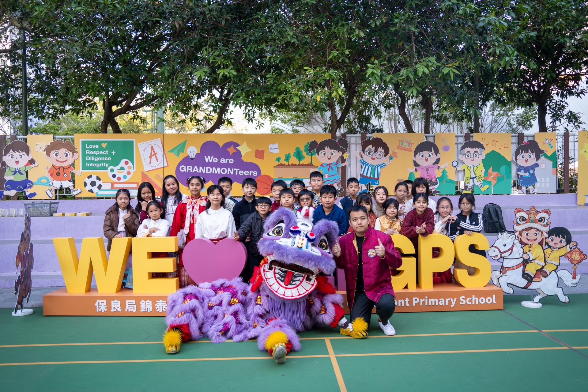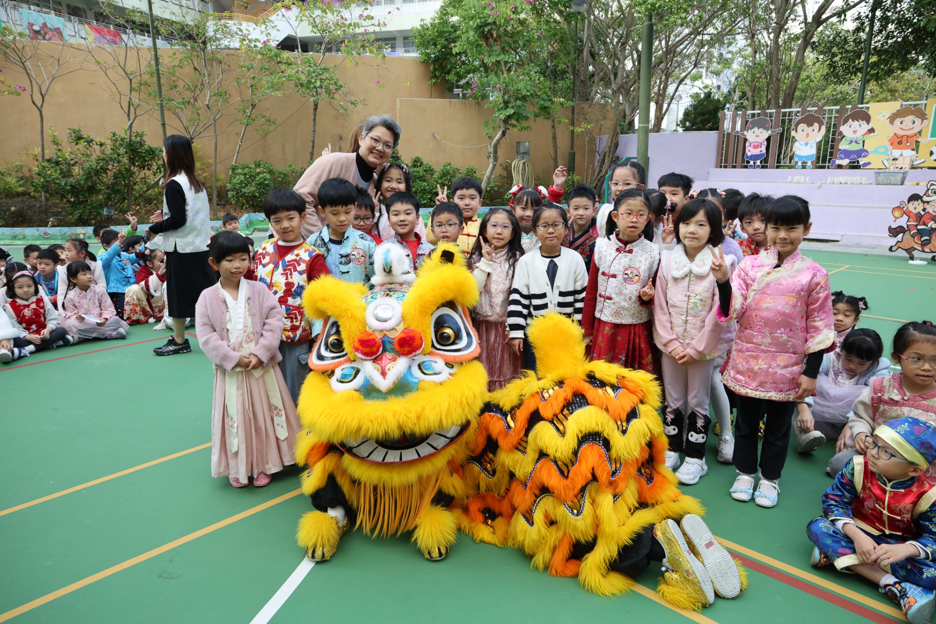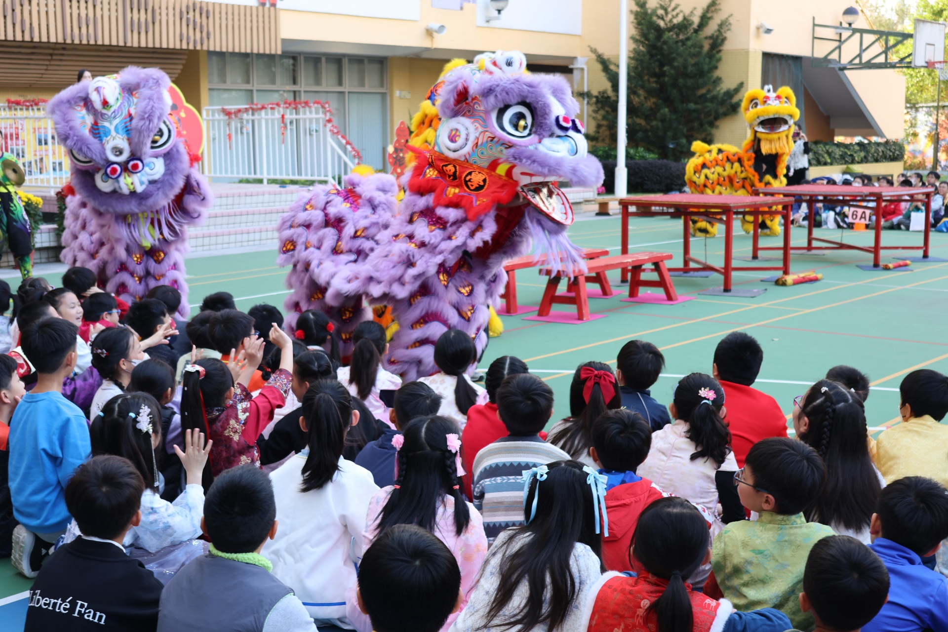 本校邀請到佛教何南金中學的舞獅隊到校表演。活動伊始,吳校長、劉副校長與家教會主席手持朱砂筆,為威風凜凜的醒獅點睛開光。醒獅活躍地在操場上翻騰跳躍。活動尾聲,舞獅隊與同學們歡樂合照,大家爭相觸摸獅頭沾取好運。