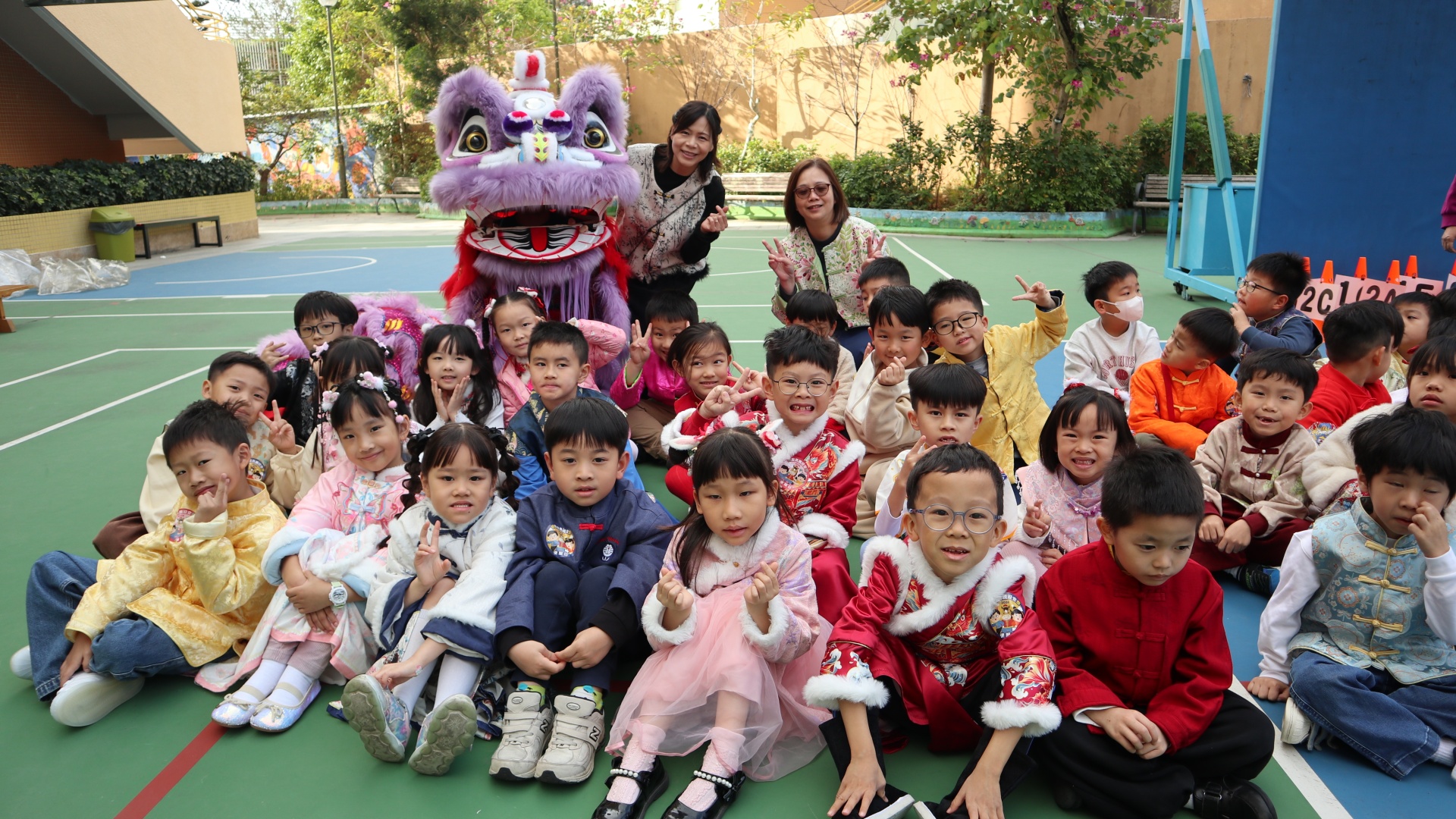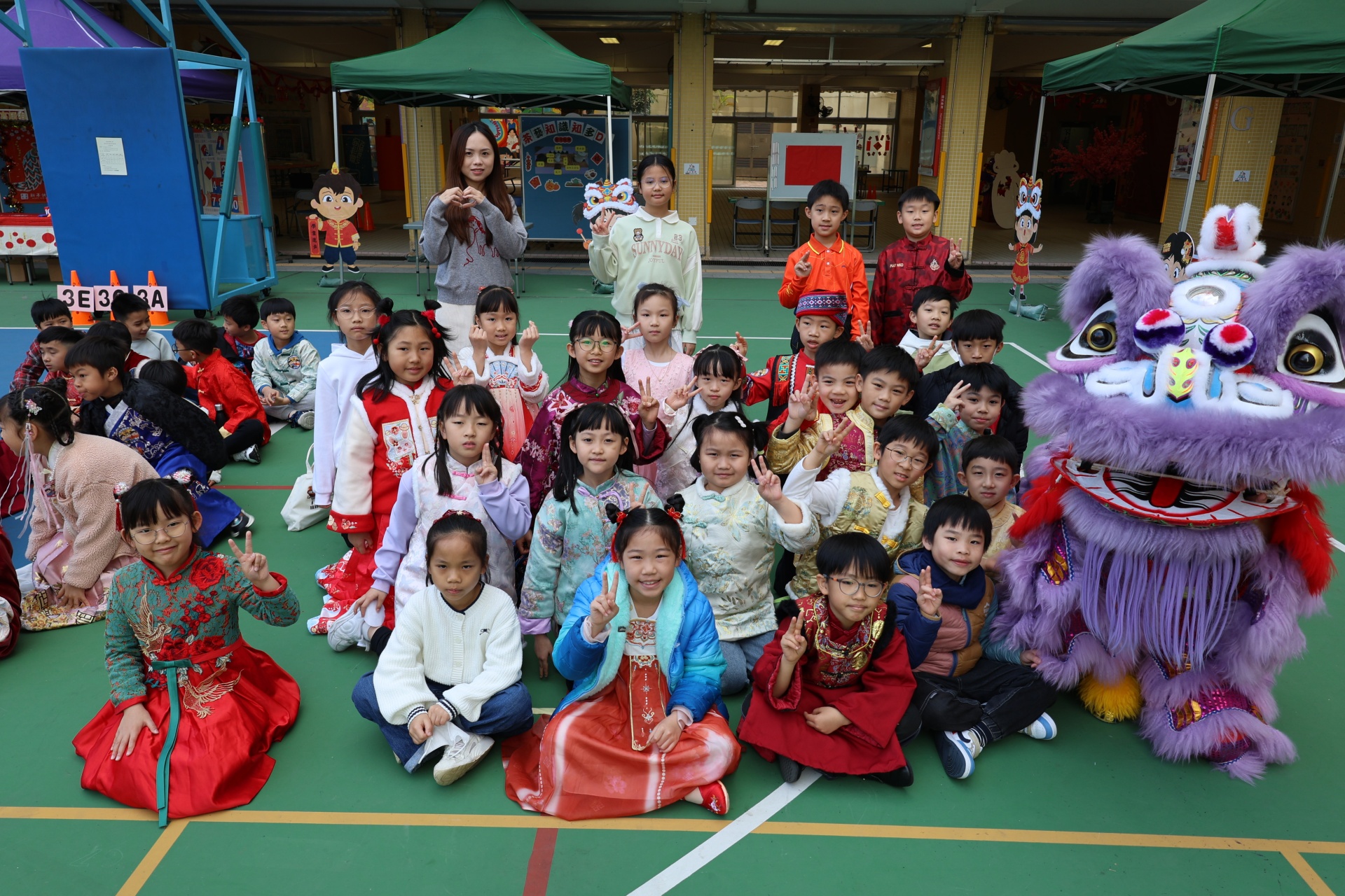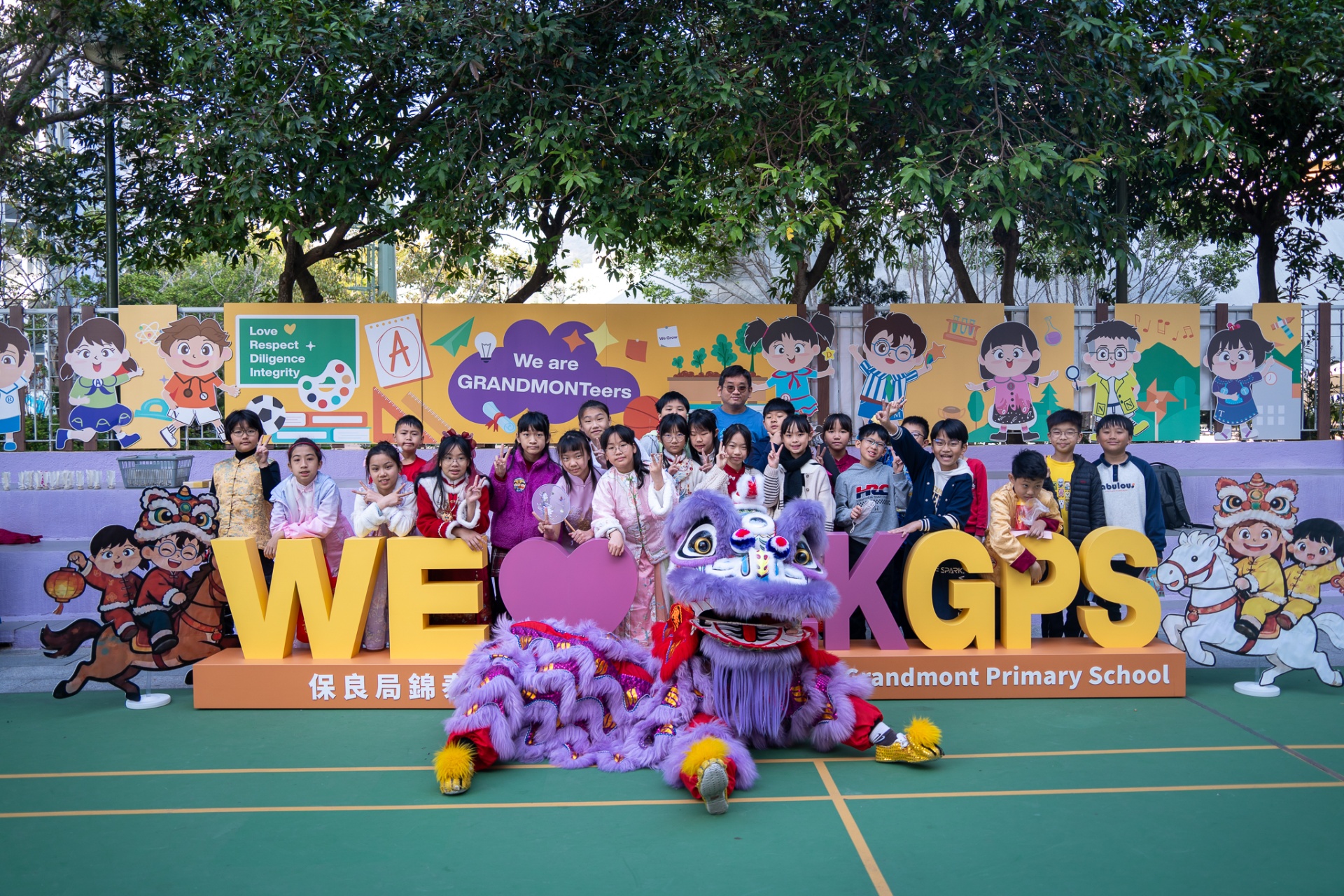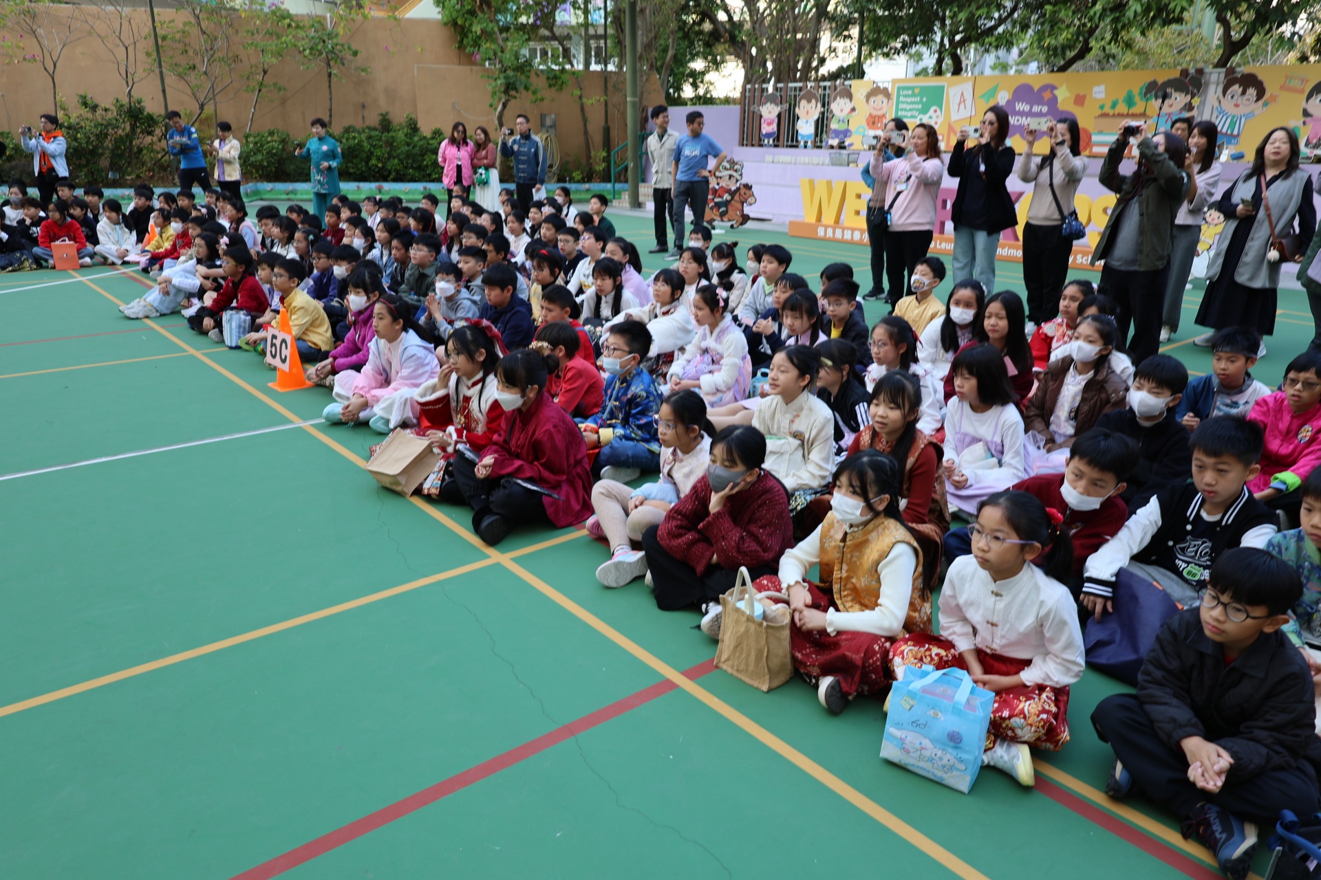 本校邀請到佛教何南金中學的舞獅隊到校表演。活動伊始,吳校長、劉副校長與家教會主席手持朱砂筆,為威風凜凜的醒獅點睛開光。醒獅活躍地在操場上翻騰跳躍。活動尾聲,舞獅隊與同學們歡樂合照,大家爭相觸摸獅頭沾取好運。