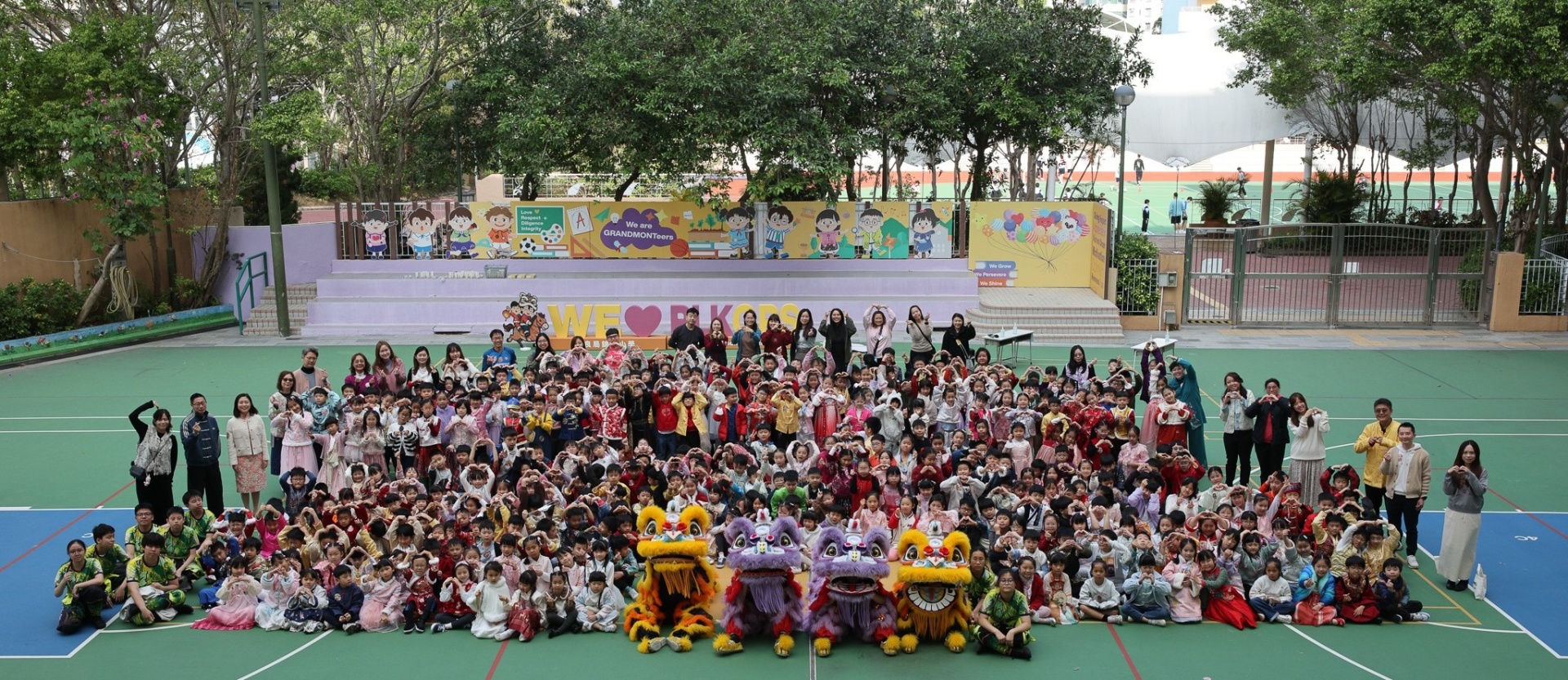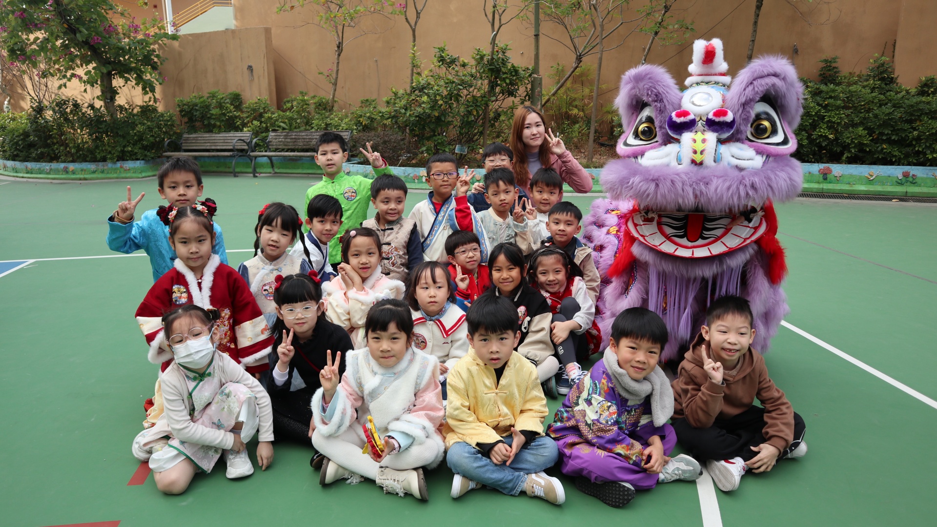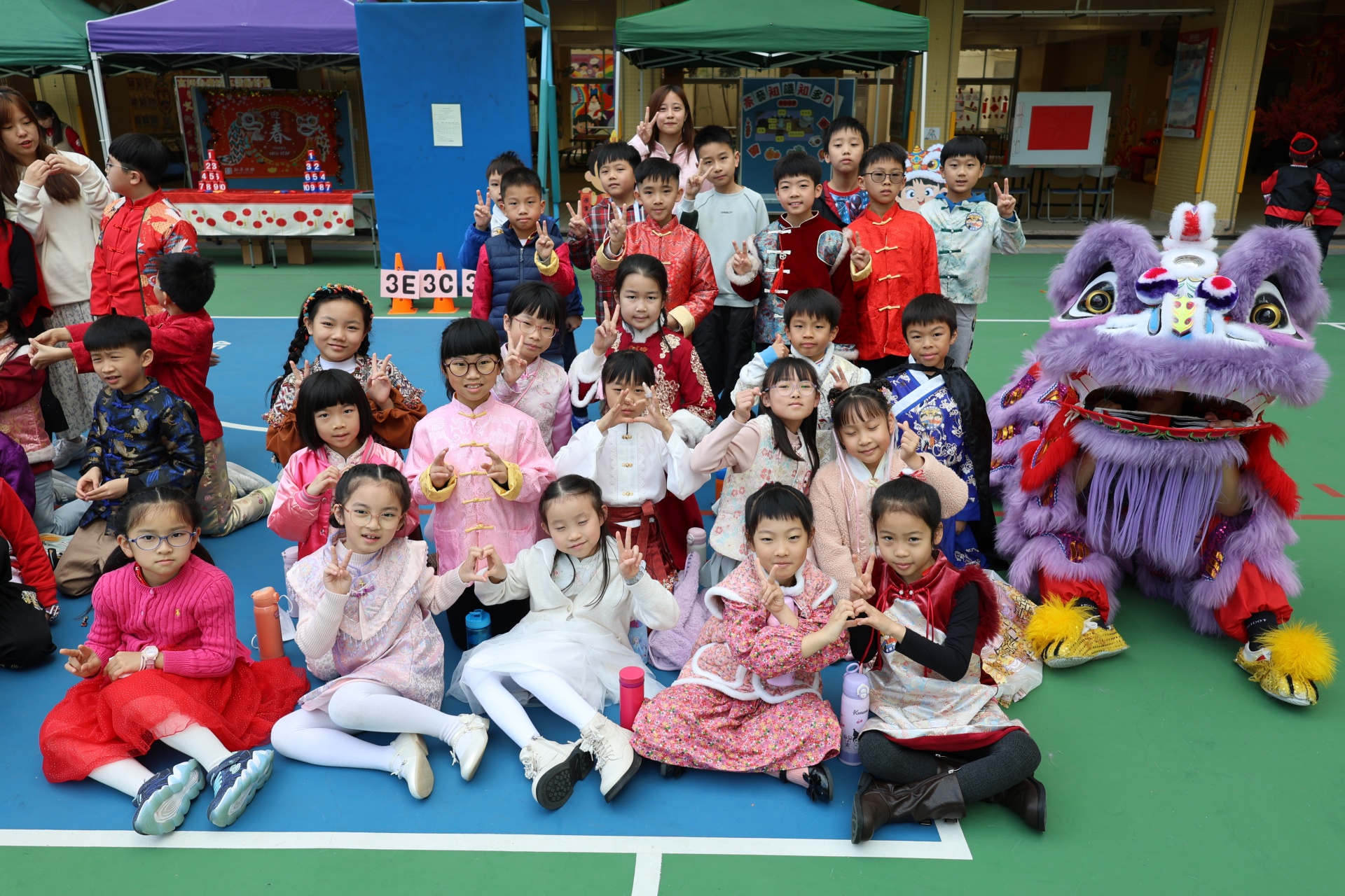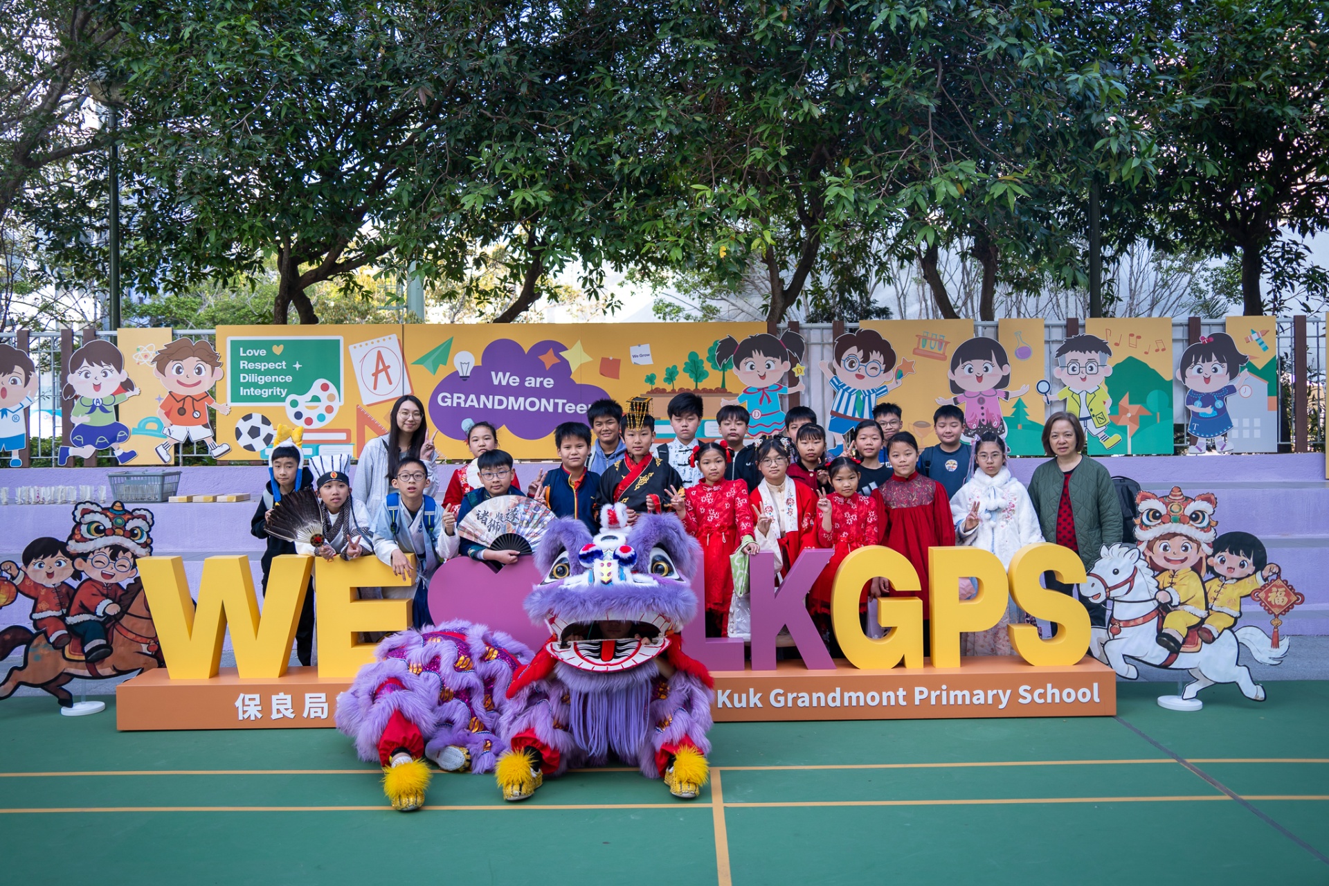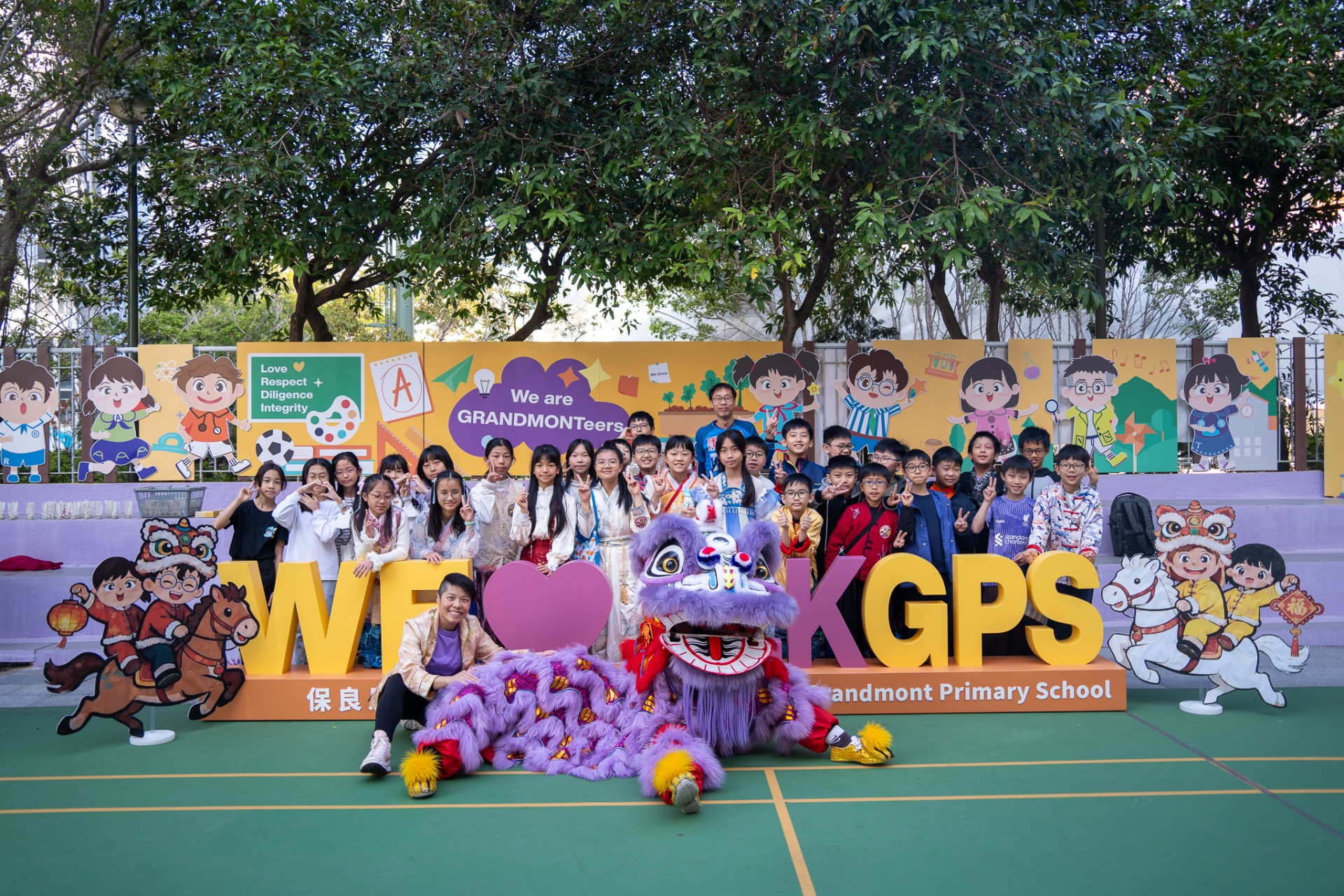 本校邀請到佛教何南金中學的舞獅隊到校表演。活動伊始,吳校長、劉副校長與家教會主席手持朱砂筆,為威風凜凜的醒獅點睛開光。醒獅活躍地在操場上翻騰跳躍。活動尾聲,舞獅隊與同學們歡樂合照,大家爭相觸摸獅頭沾取好運。