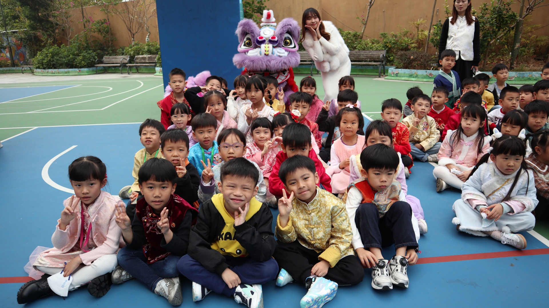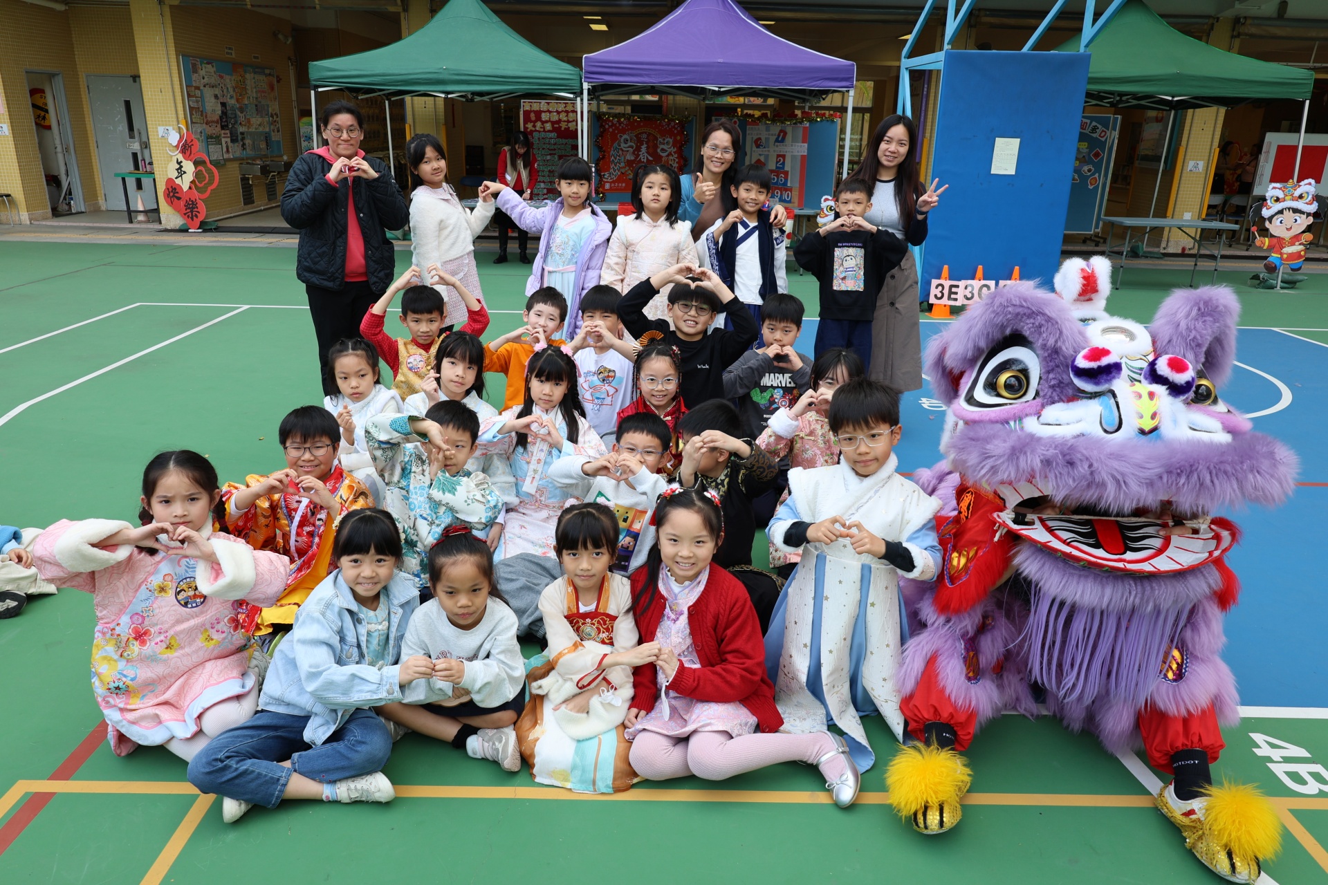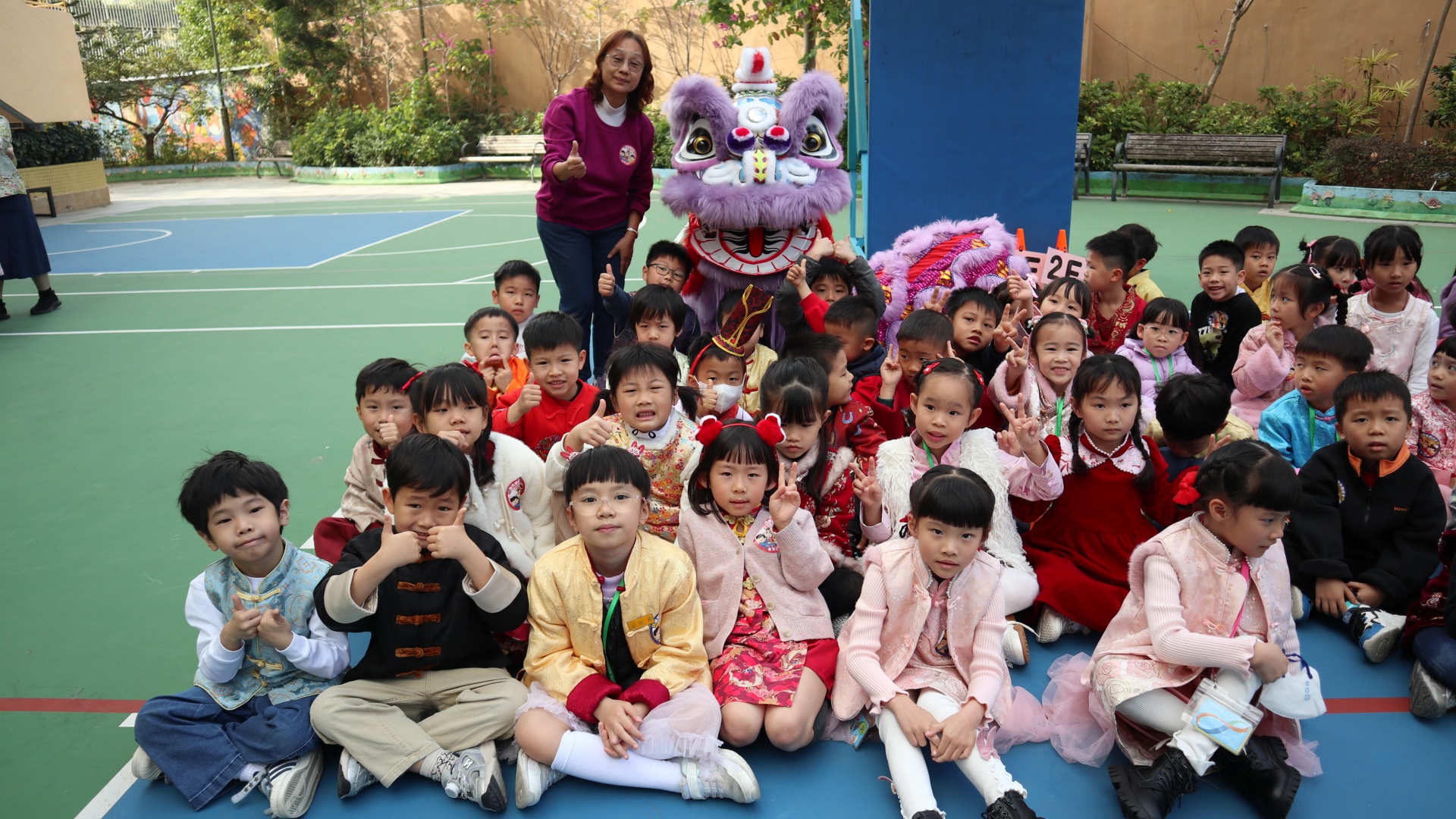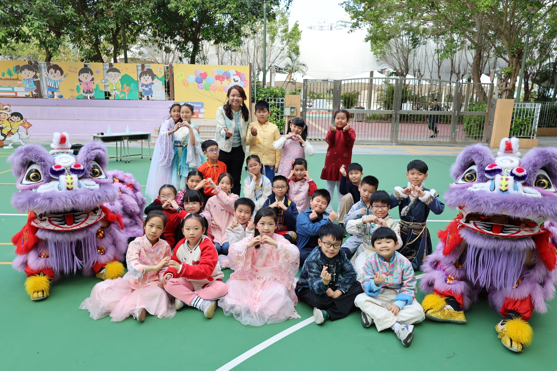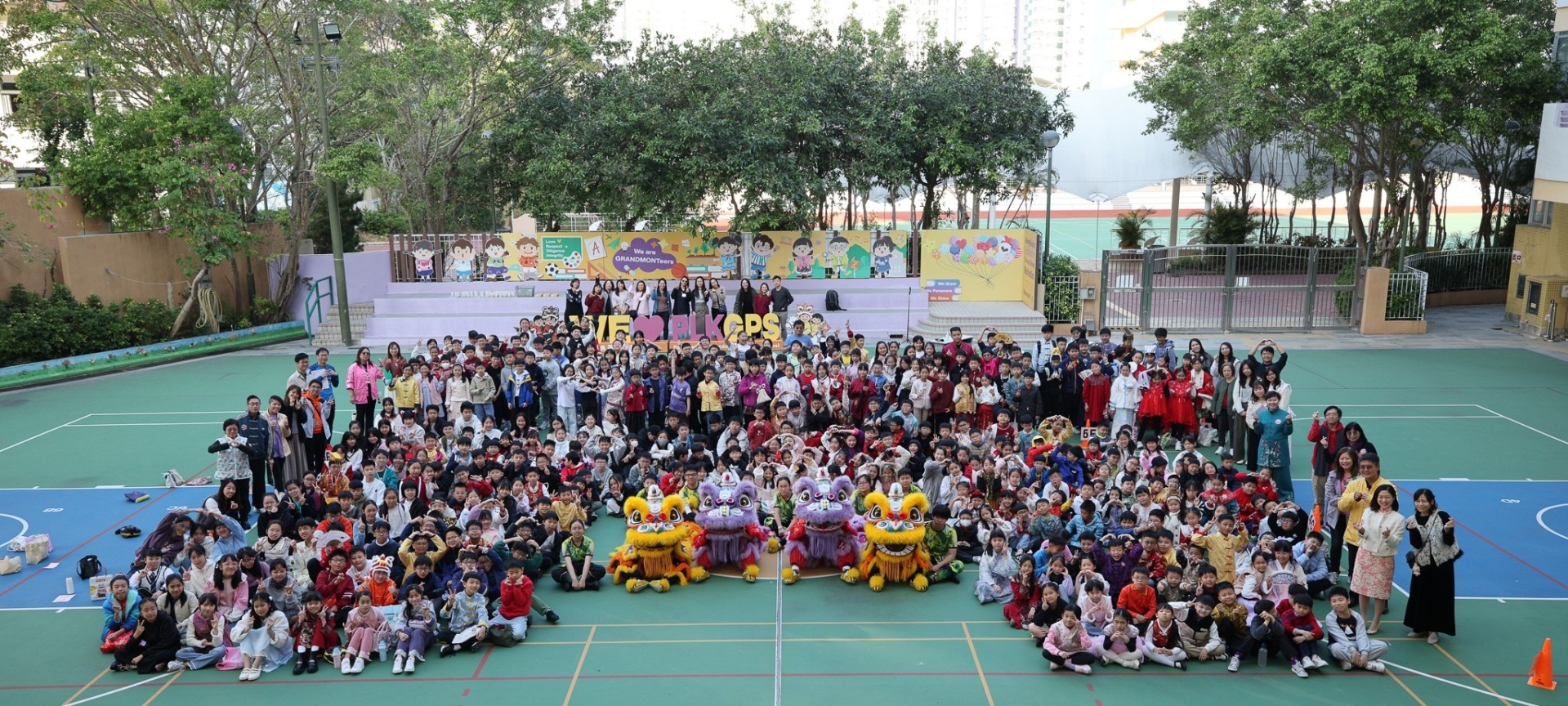 本校邀請到佛教何南金中學的舞獅隊到校表演。活動伊始,吳校長、劉副校長與家教會主席手持朱砂筆,為威風凜凜的醒獅點睛開光。醒獅活躍地在操場上翻騰跳躍。活動尾聲,舞獅隊與同學們歡樂合照,大家爭相觸摸獅頭沾取好運。